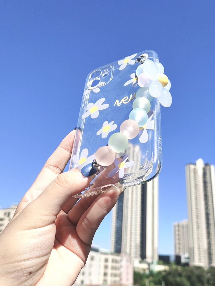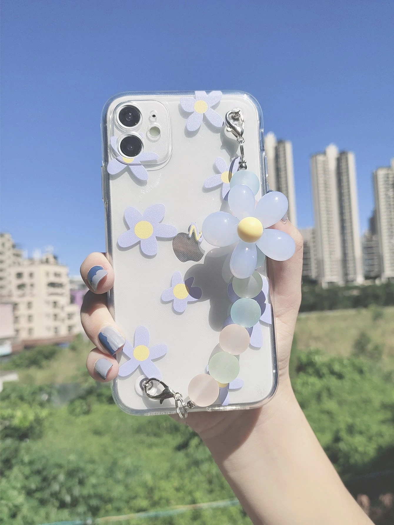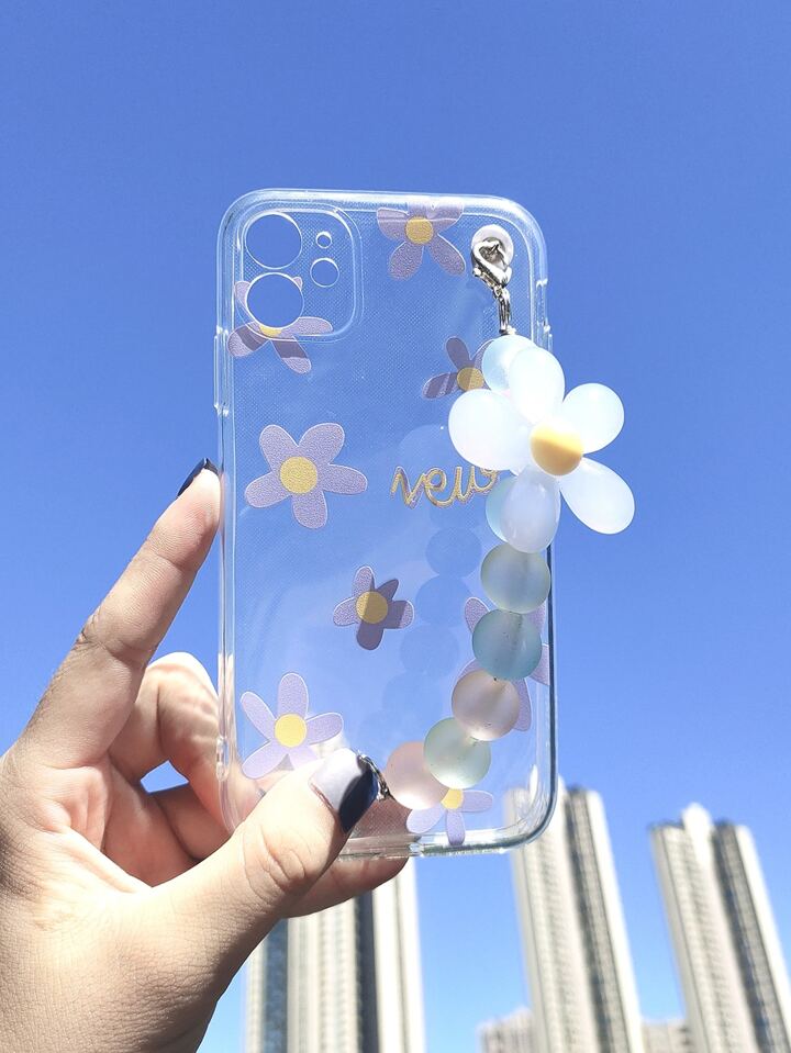 Flower Pattern Phone Case With Beaded Chain Hand Strap