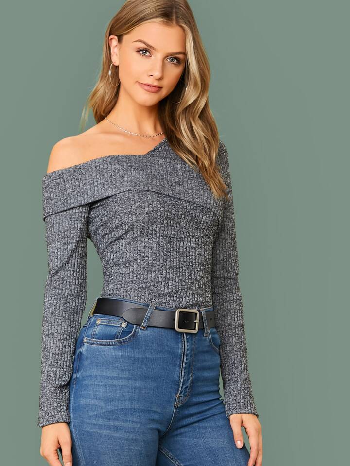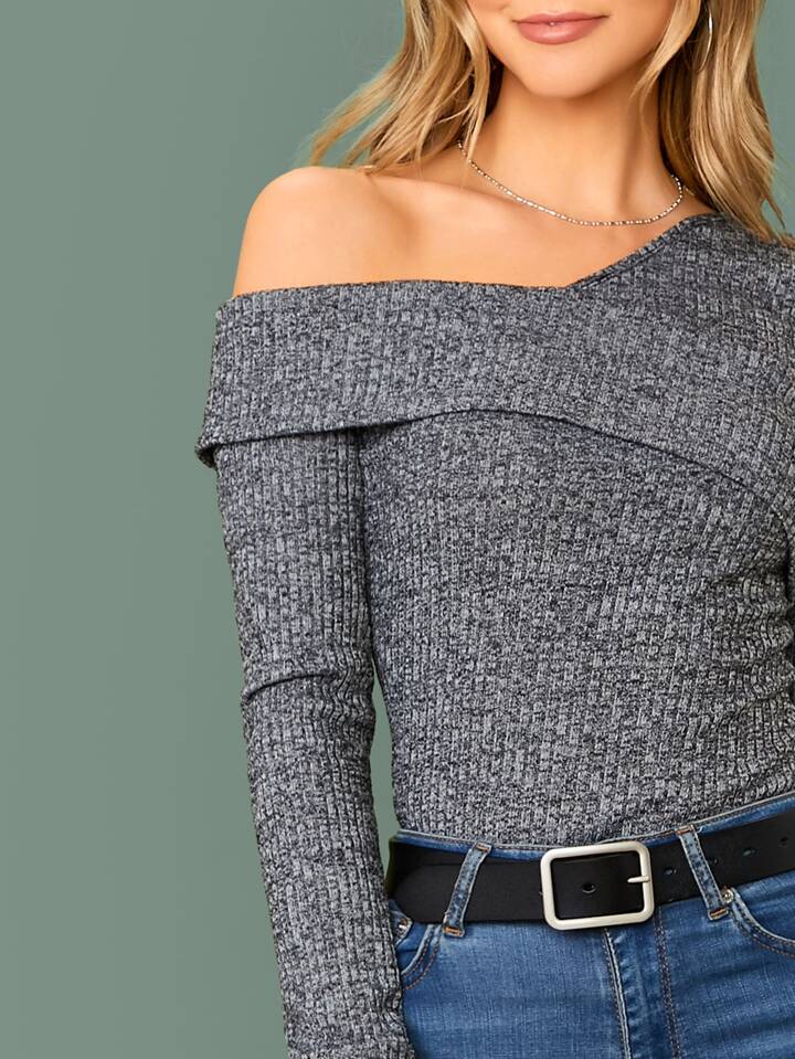 Foldover Asymmetrical Neck Rib-knit Marled Top