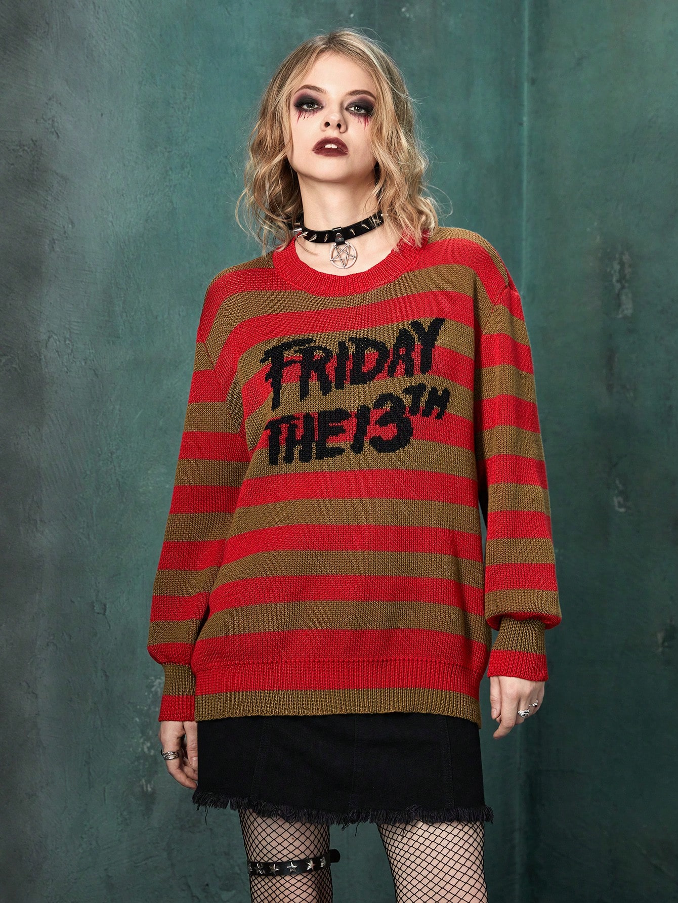 Friday the 13th X ROMWE Slogan Pattern Striped Drop Shoulder Sweater