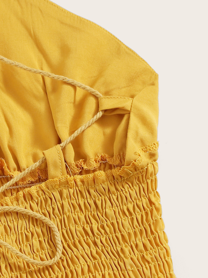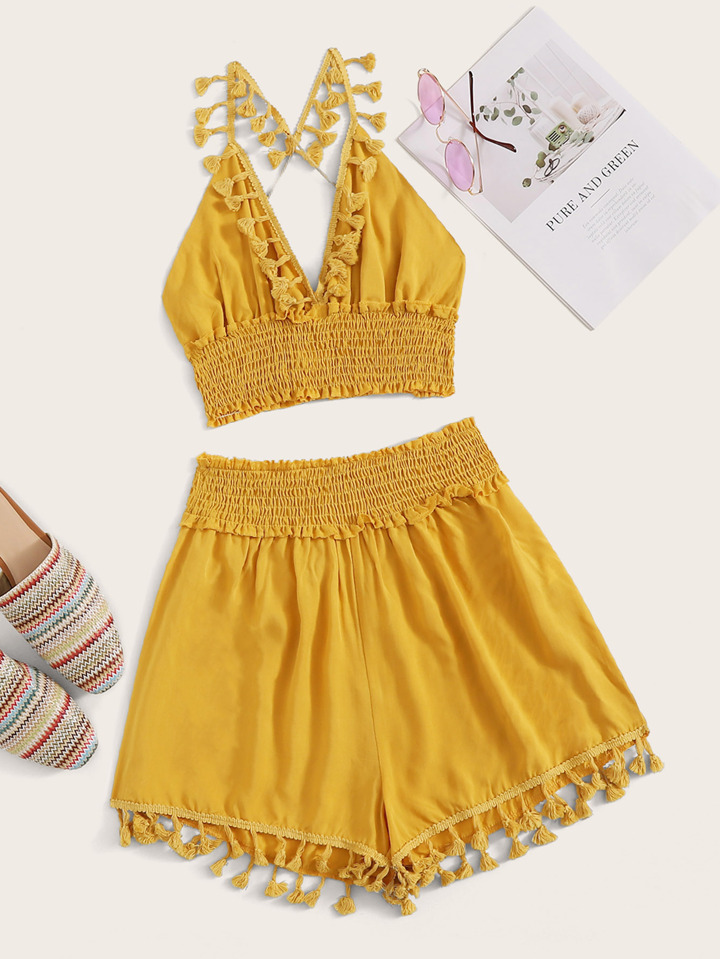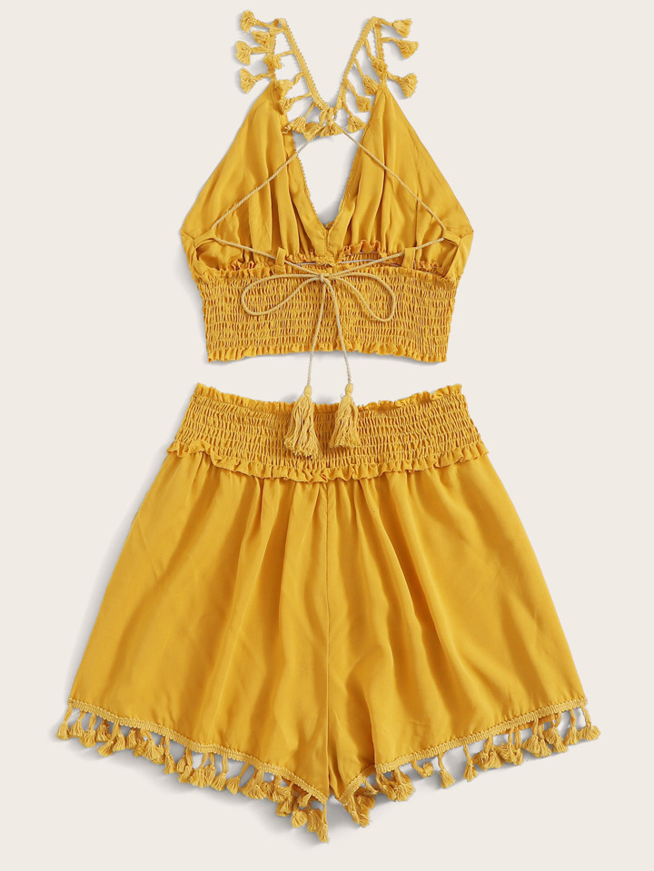 Fringe Trim Shirred Criss Cross Halter Top With Shorts