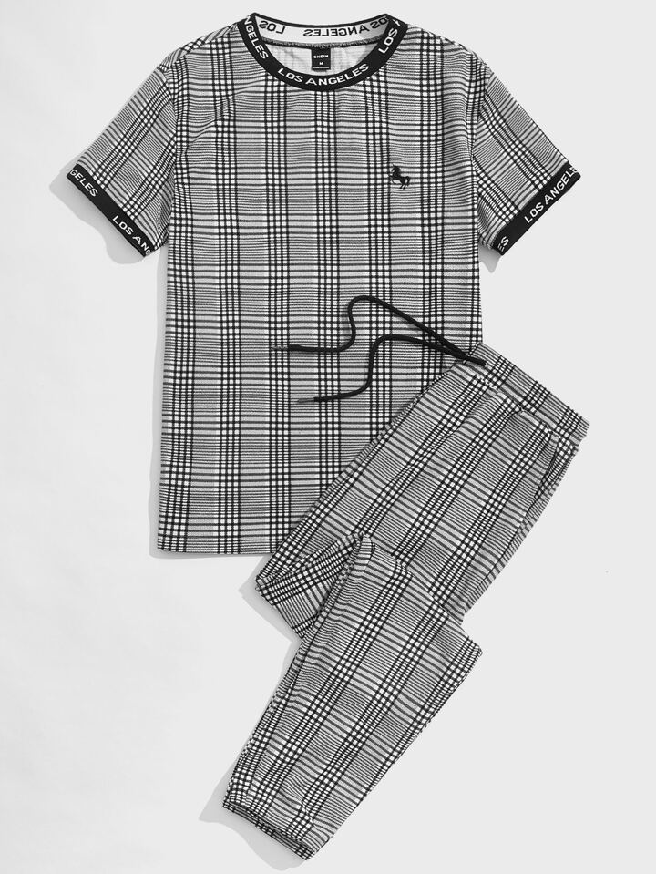 GENTILAND Guys Plaid Print & Cartoon Embroidered Tee & Drawstring Waist Pants