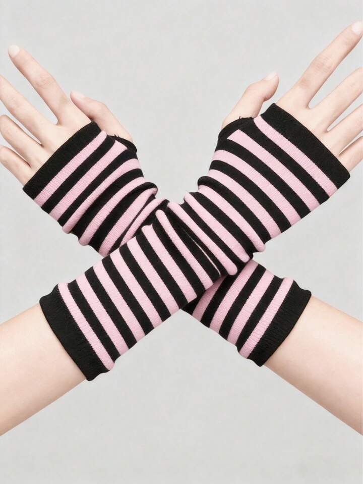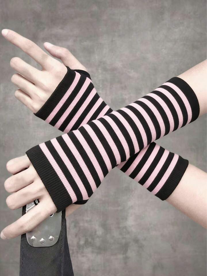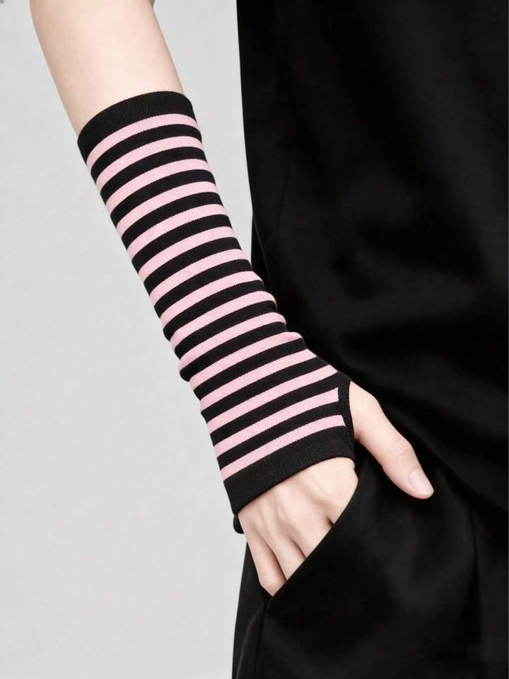 Goth 1 Pair Of Minimalist Style Knitted Gloves, Y2K Style Solid Color Striped Arm Cover, Black Pink Striped Contrasting Color Spring And Autumn Thin Warm Arm Cover