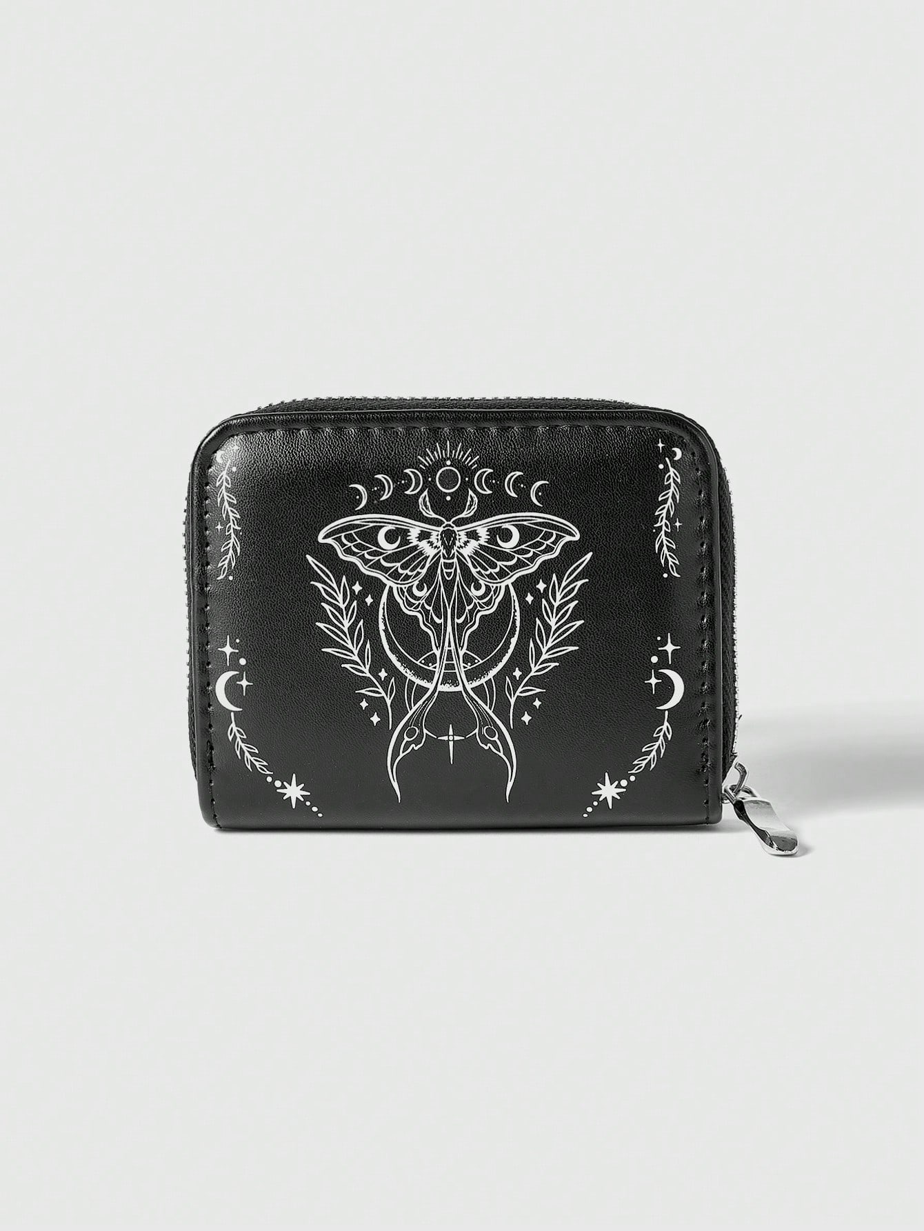 Goth 1 Piece, Moth Plant Star And Moon Short Minimalist Style Zipper Coin Wallet, Suitable For Women