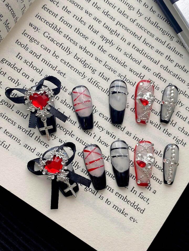 Goth 10 Long Coffin Nail Red Ribbon Black And Red Line Graphic Design Press On Nails With Charm Decor, Suitable For Ladies, Girls In The Stage, Dance, Party Scenes, With 1 Piece Of Jelly Roll 1 Piece