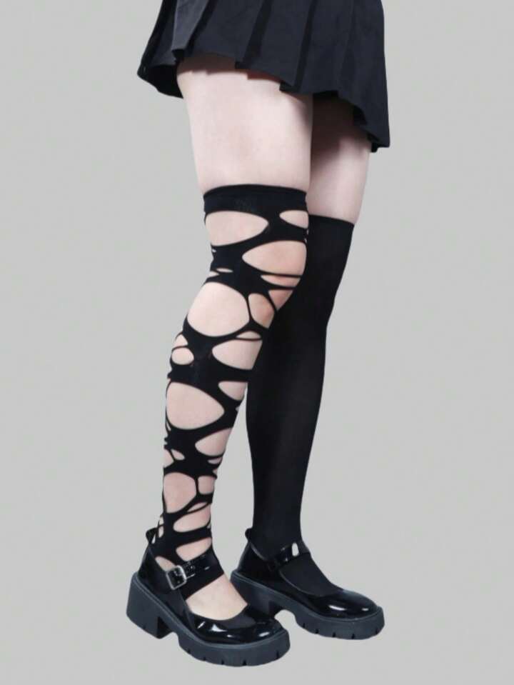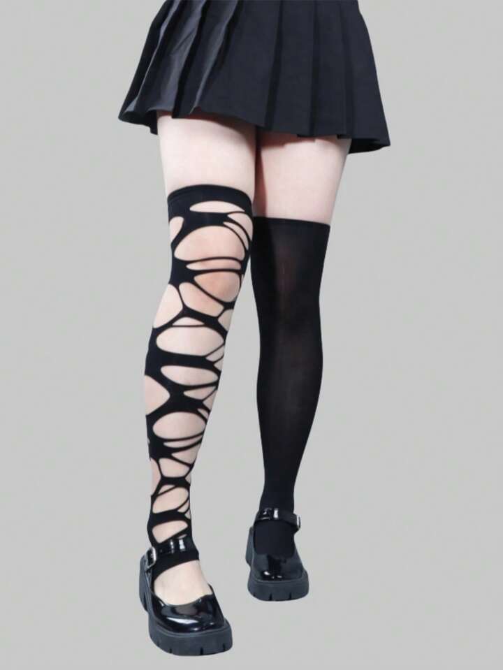 Goth 1pair Dark Black AB Ripped Over-The-Knee Socks