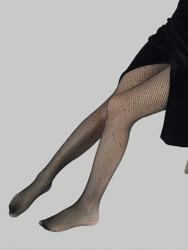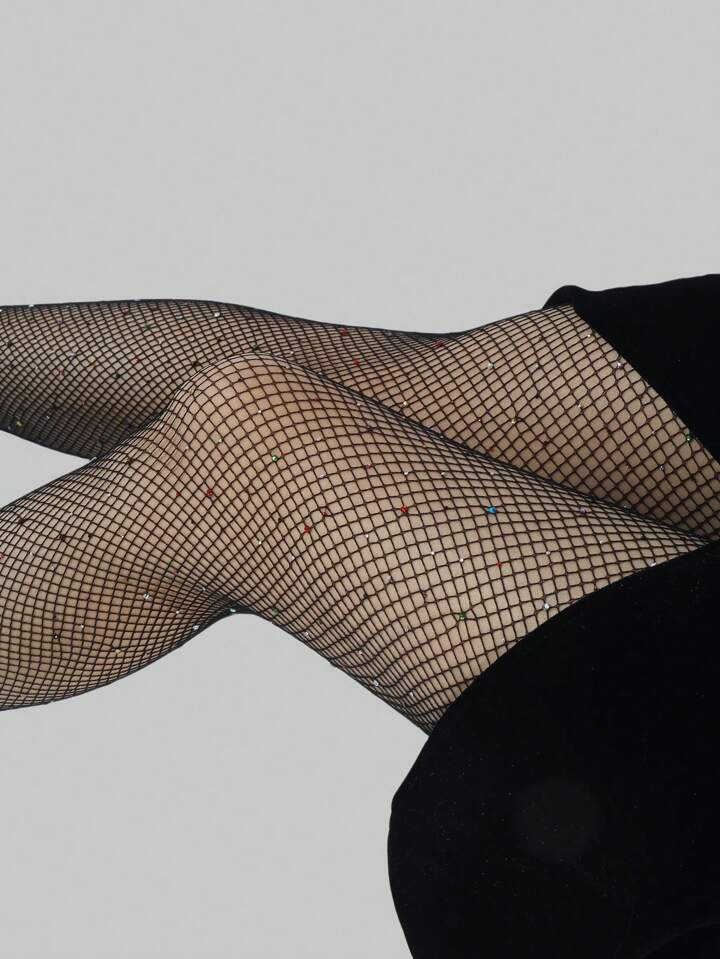 Goth 1pair Women'S Four-Season Black Fishnet Tights With Colorful Rhinestones