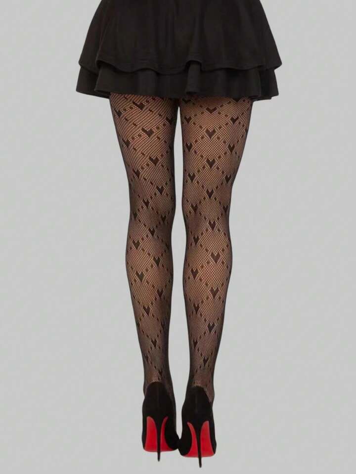 Goth 1pair Women's All-Season Black Heart & Rhombus Pattern Fishnet Stockings For Valentine's Day