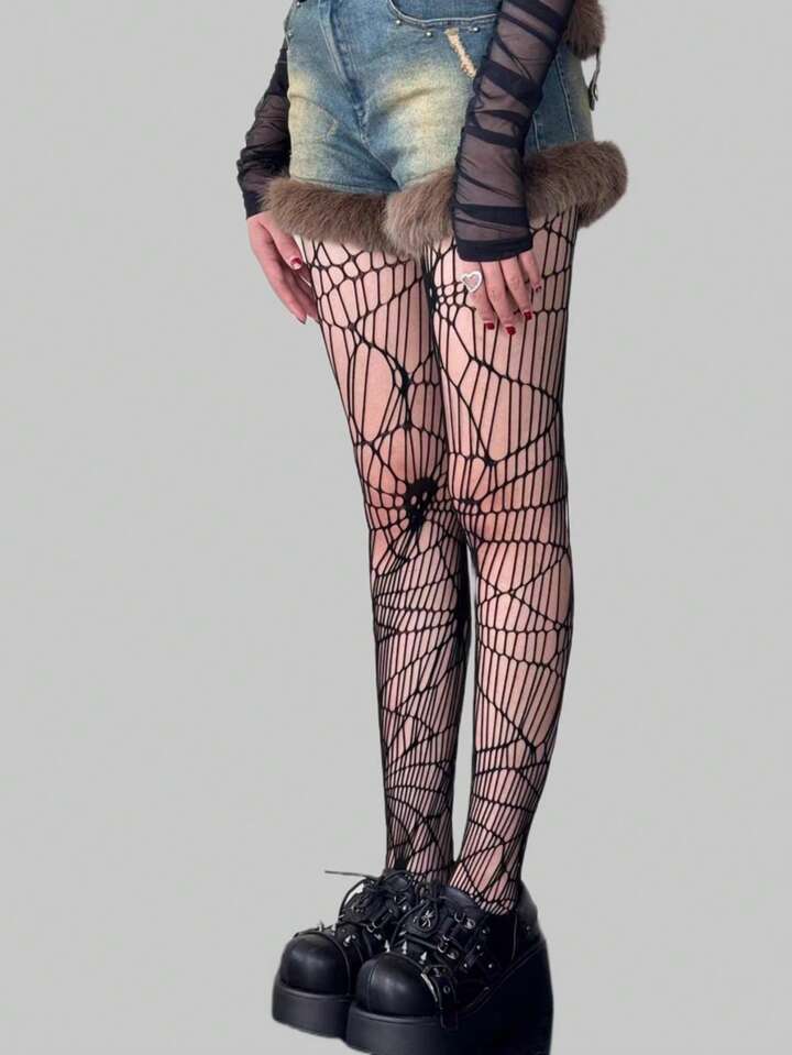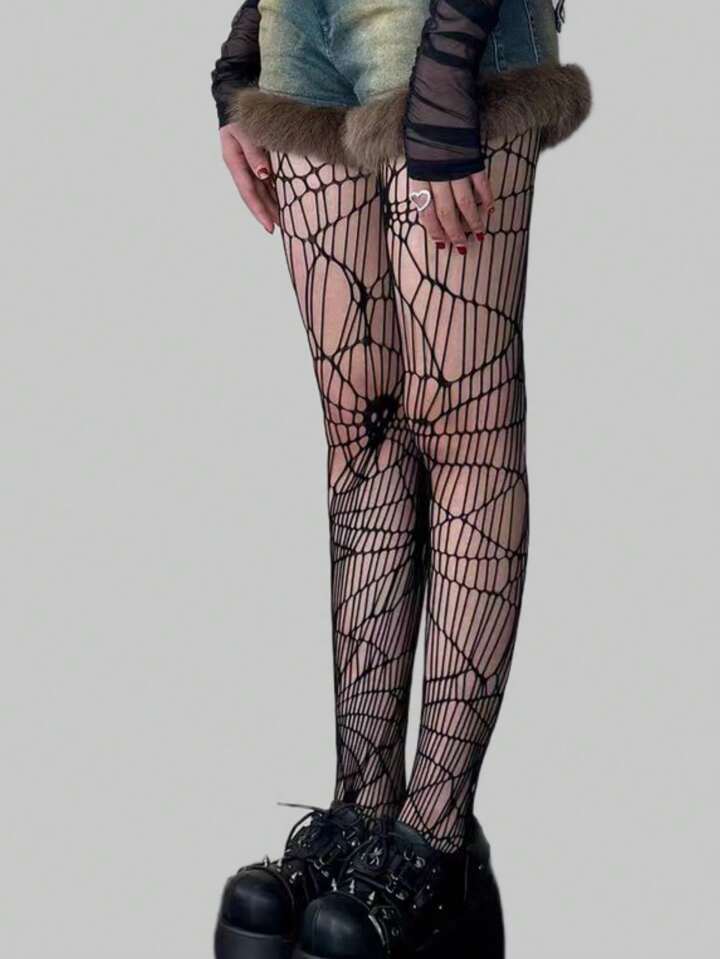 Goth 1pair Women's Black Skull Patterned Fishnet Stockings, All Seasons