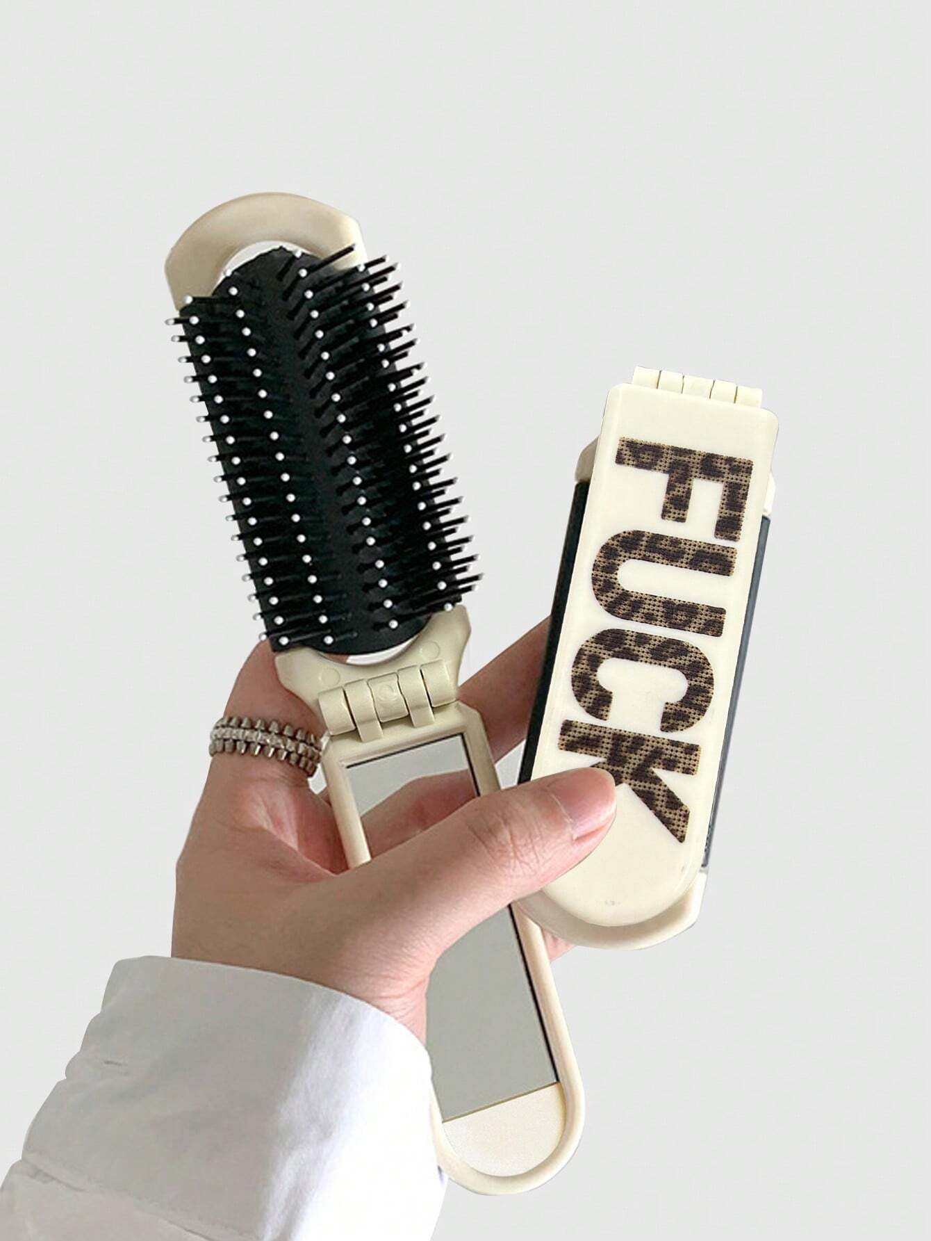 Goth 1pc Beige Color Letter Print Combined Folding Comb With Mirror, Portable And Detachable (Pattern Position Random)