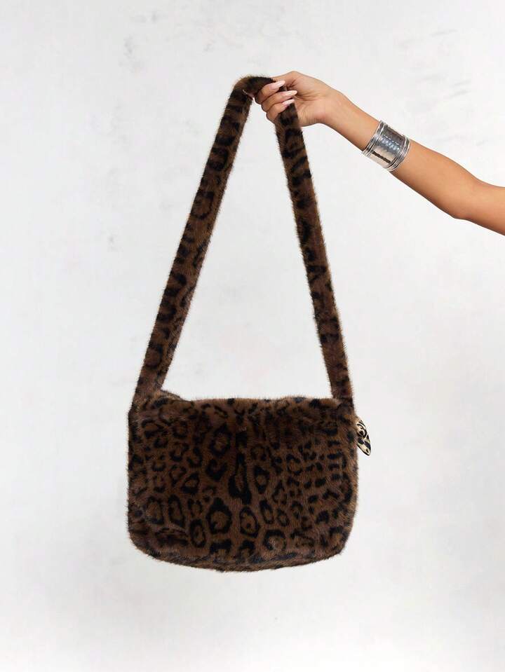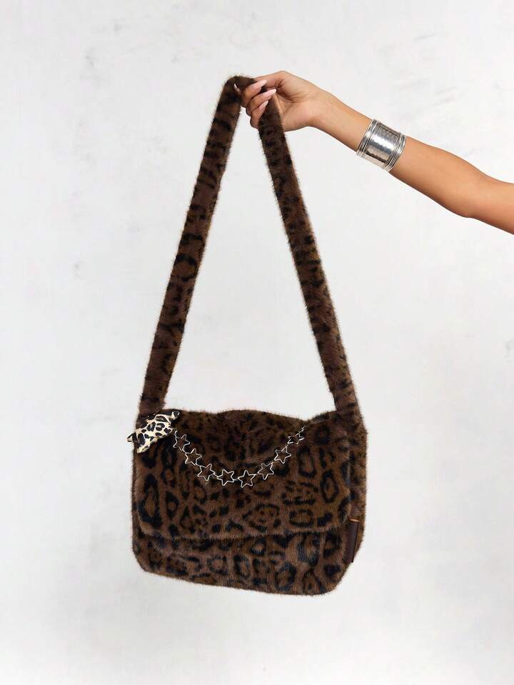 Goth 1pc Brown Y2K Babe Leopard Print Kawaii Cute Star Retro Punk Subculture Myopia Chain Decor Plush Leopard Print Fashion Minimalist Crossbody Bag, Suitable For College, Shopping, Commuting, Music Festivals, Etc.