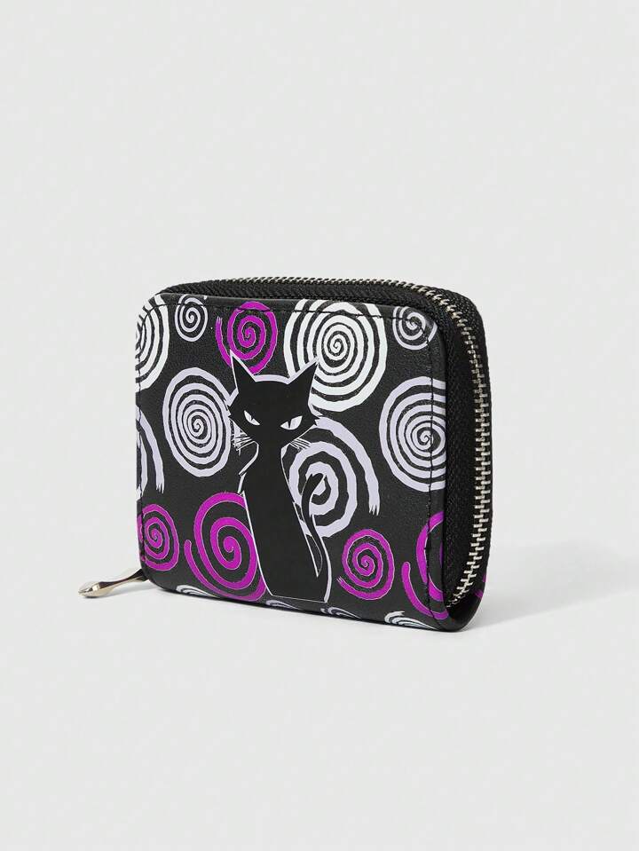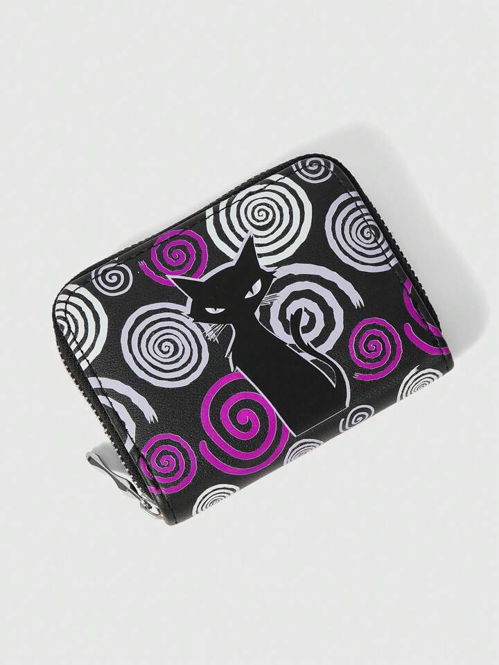 Goth 1pc Halloween Black Cat Swirl Pattern Compact Zipper Wallet For Women