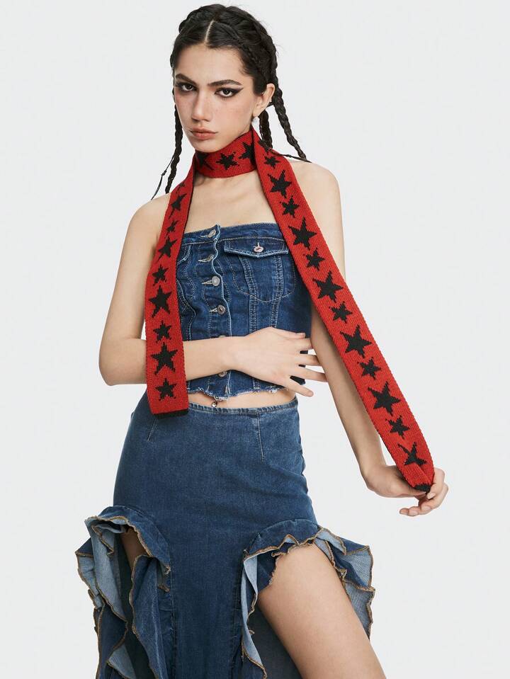 Goth 1pc Knitted Scarf With Black & Red Five-Pointed Star Pattern