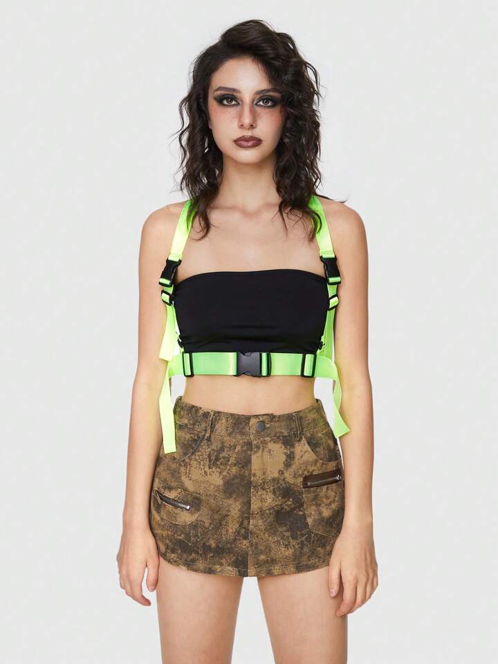 Goth 1pc Ladies' Fluorescent Green Canvas Suspenders With Double Plastic Release Buckle And Adjustable Strap For Versatile Daily Wear