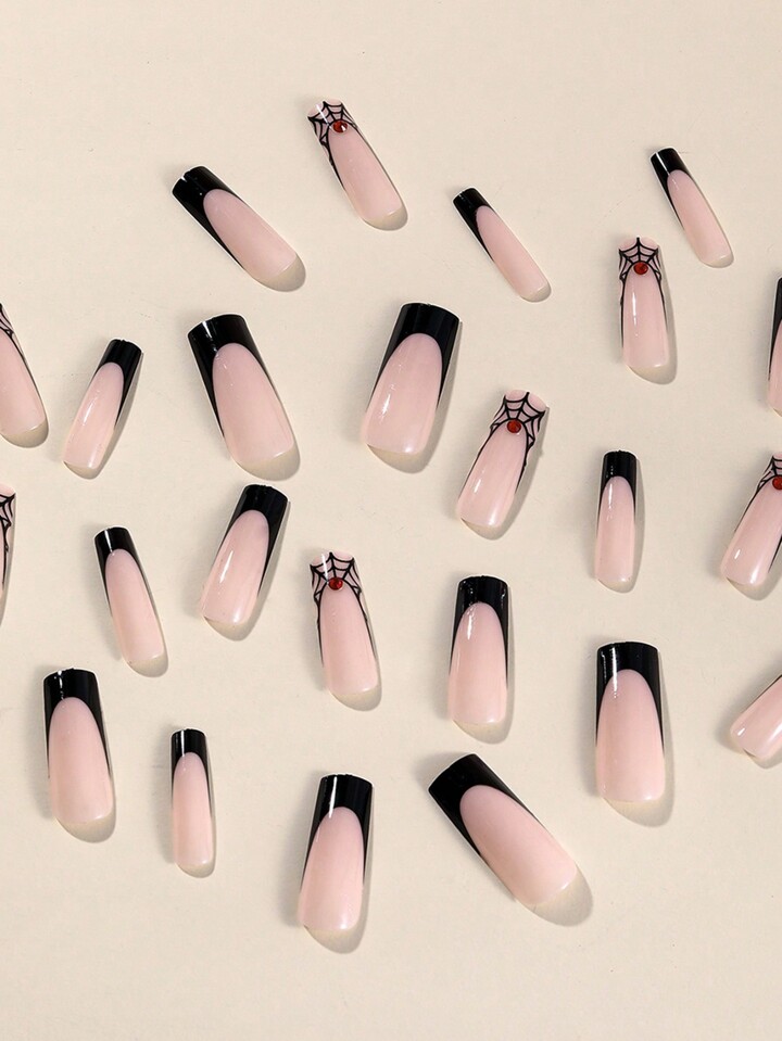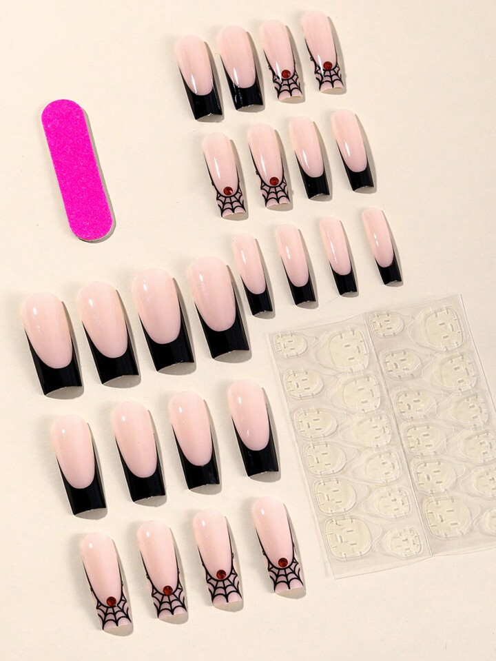 Goth 24pcs Long Coffin Spider Web Pattern Fake Nail & 1pc Nail File & 1sheet Tape