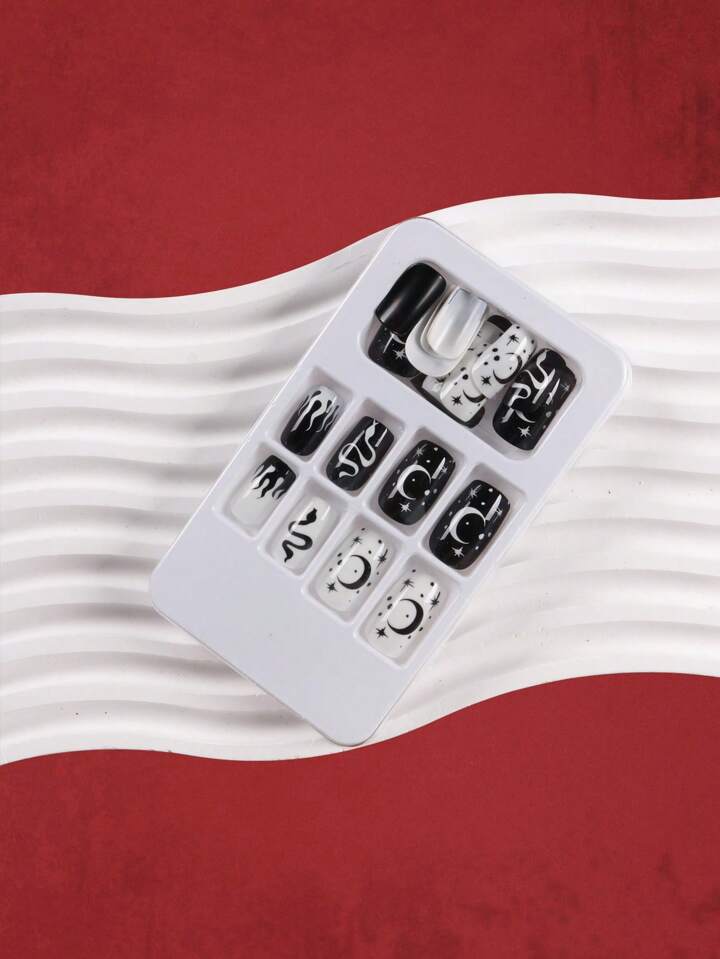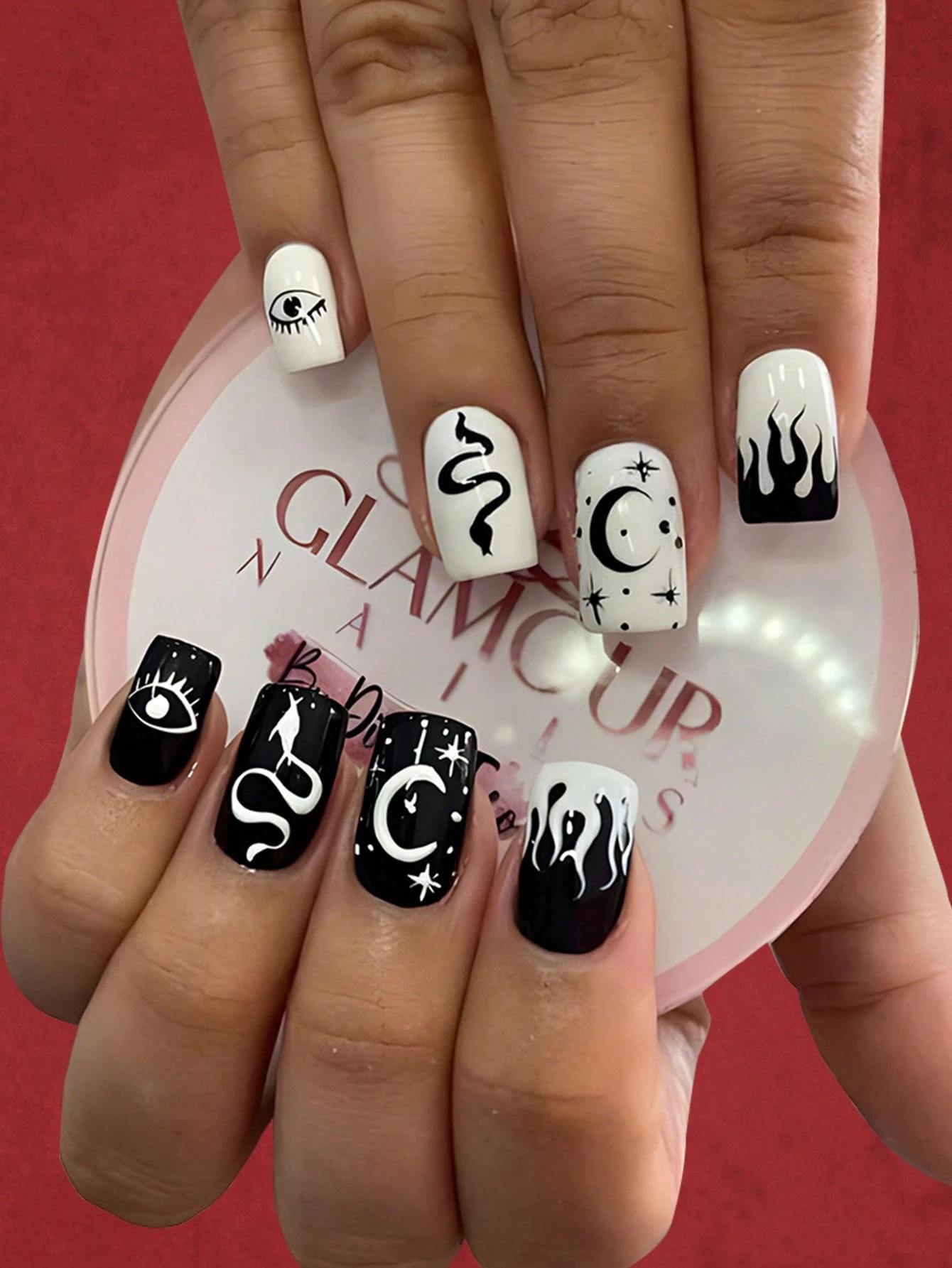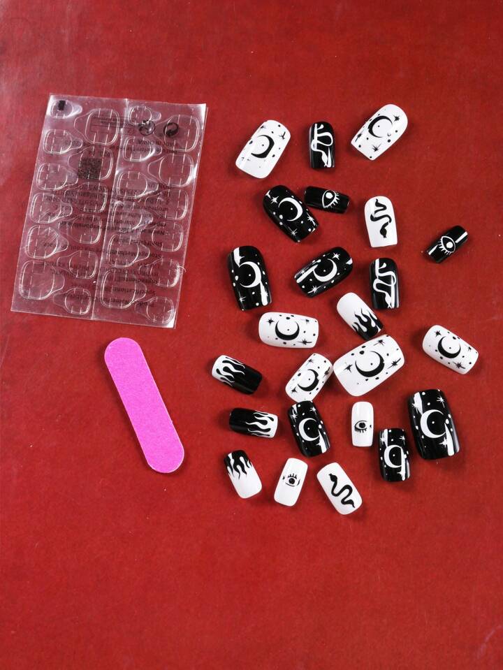 Goth 24pcs Short Coffin Fire Pattern Fake Nail & 1sheet Tape & 1pc Nail File