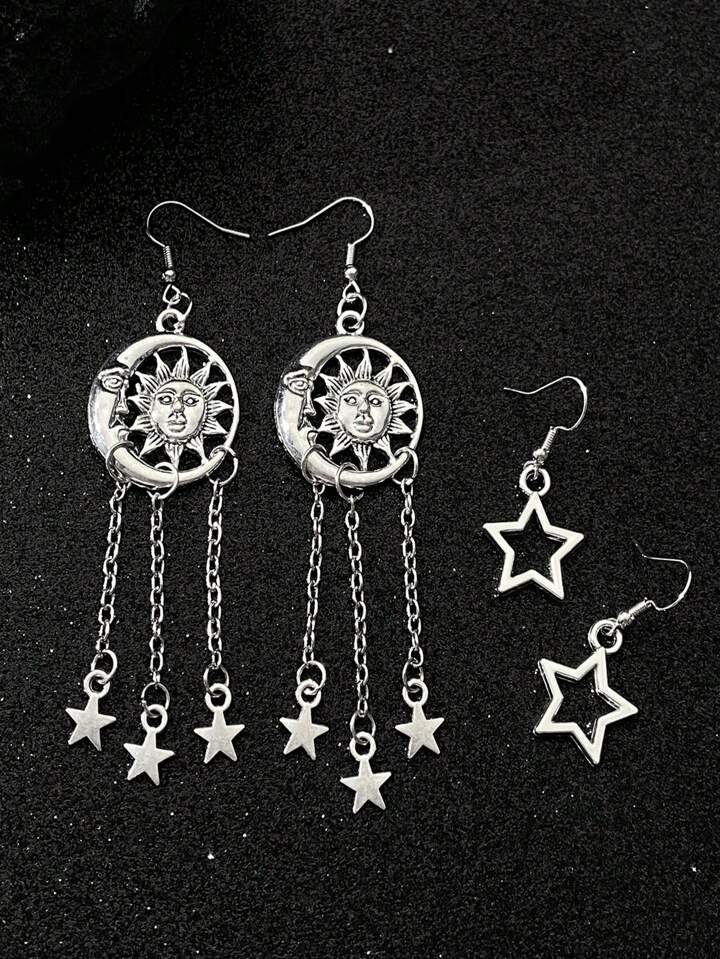 Goth 2pairs/set European And American Vintage Hollow Out Star, Moon, Sunshine, Flower, Tassel Pendant Dangle Earrings