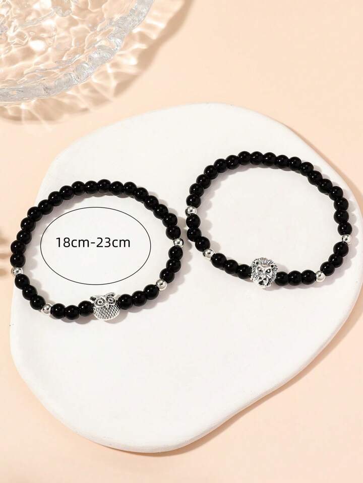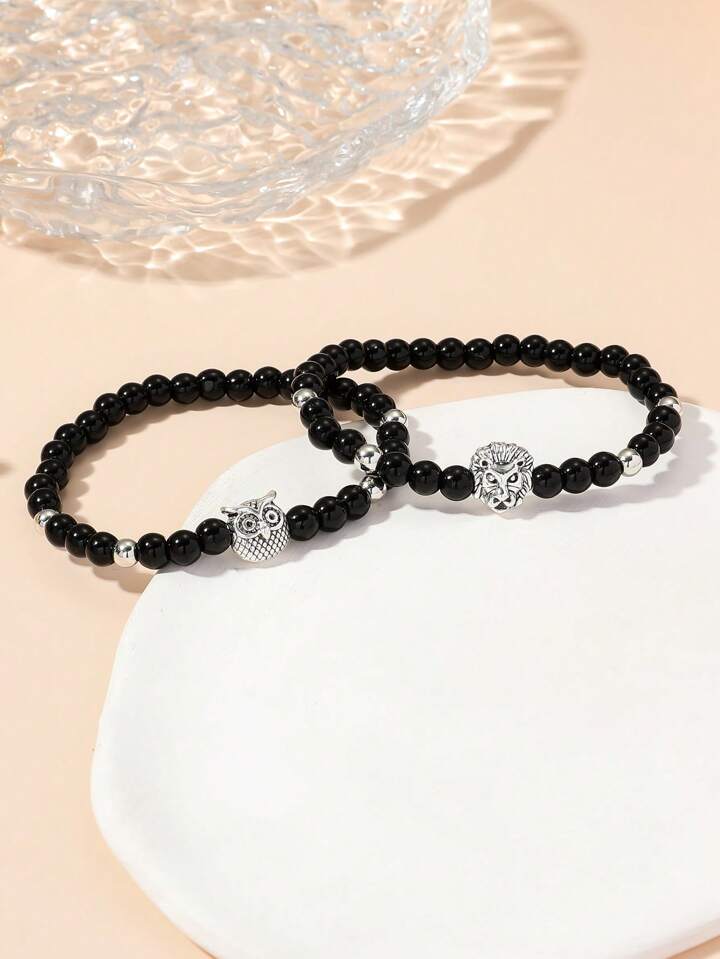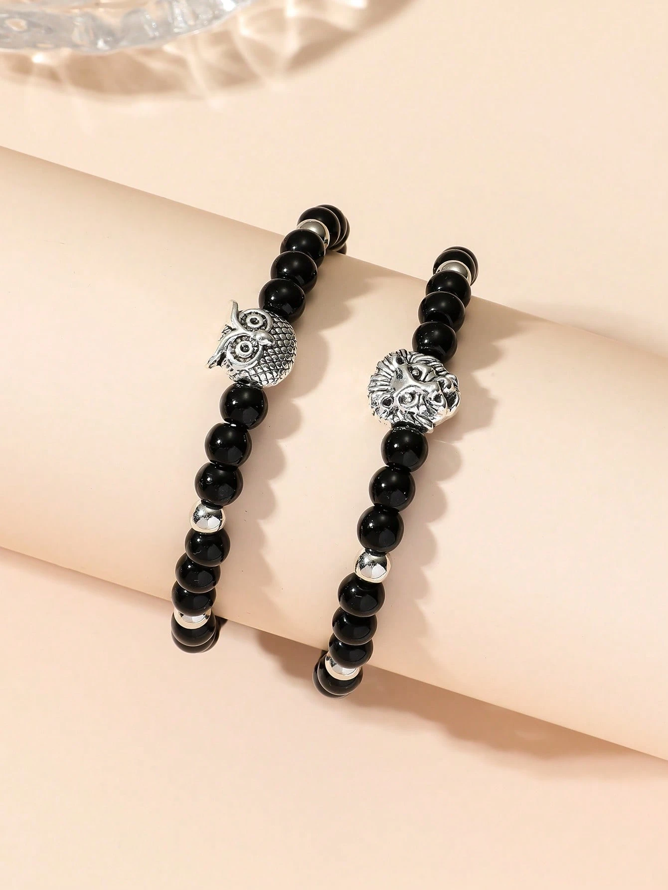 Goth 2pcs Fashion Glass Owl & Lion Decor Beaded Bracelet For Women For Daily Decoration