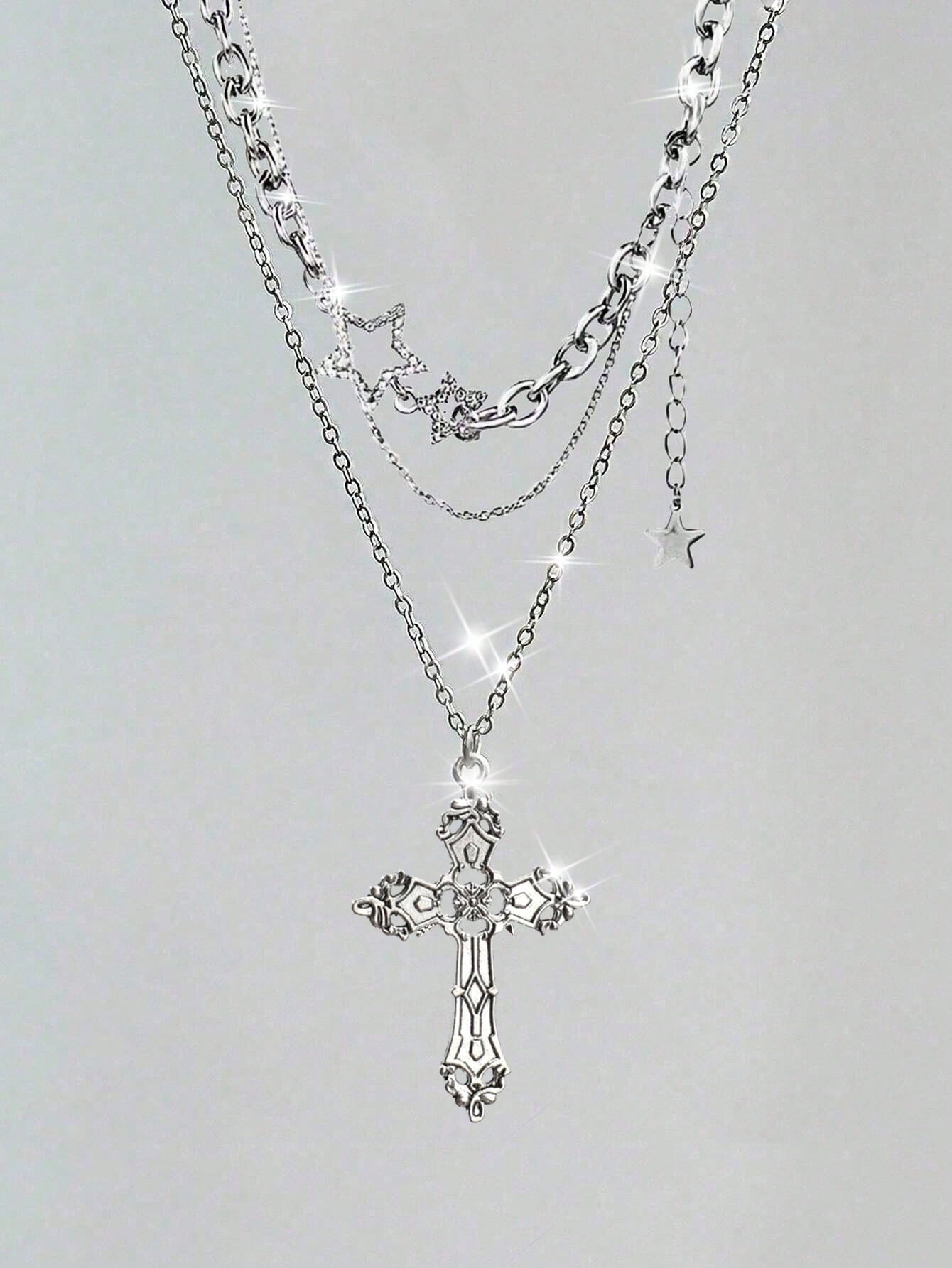 Goth 2pcs Punk Vintage Style Rhinestone Star Pendant Necklace, Luxury Iced Out Double Layer Star Chain Necklace, Streetwear Choker