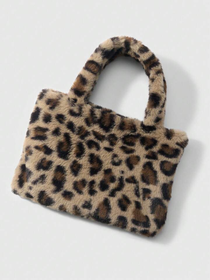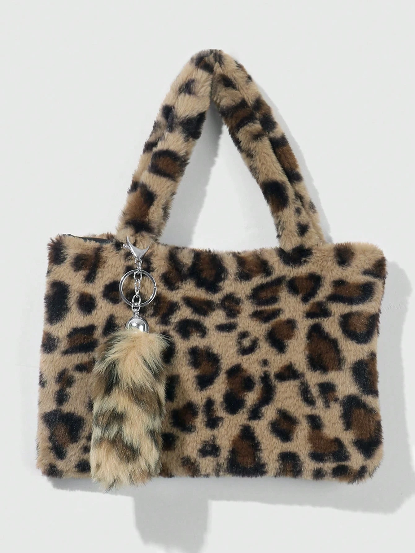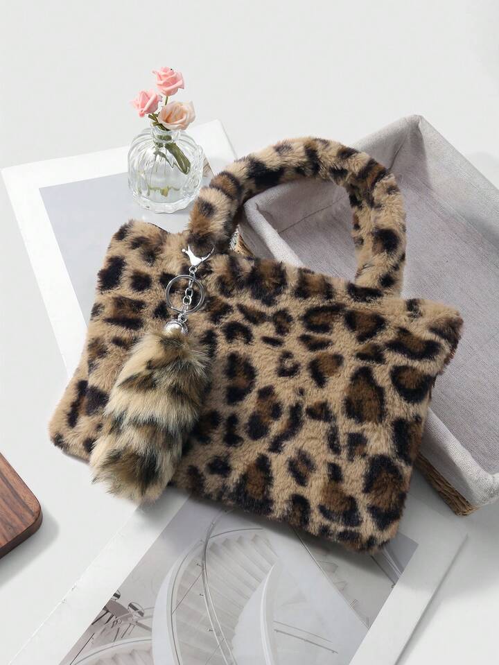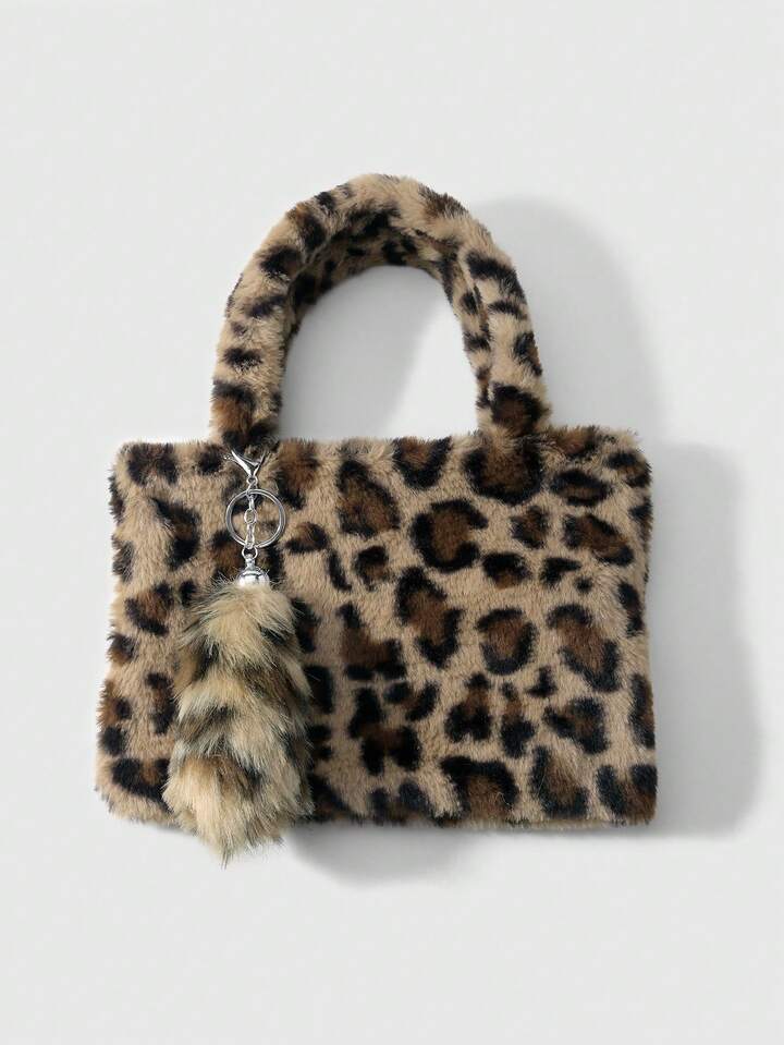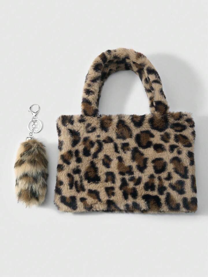 Goth 2pcs Y2K Fashionable Retro Chic Baddie High-Quality Brown Faux Fur Leopard/Tiger Print Handbag + Brown Fluffy Faux Fur Mini Animal Tail Keychain Bag Charm Combo Set, Suitable For Women Commute, Daily Use, Gifts