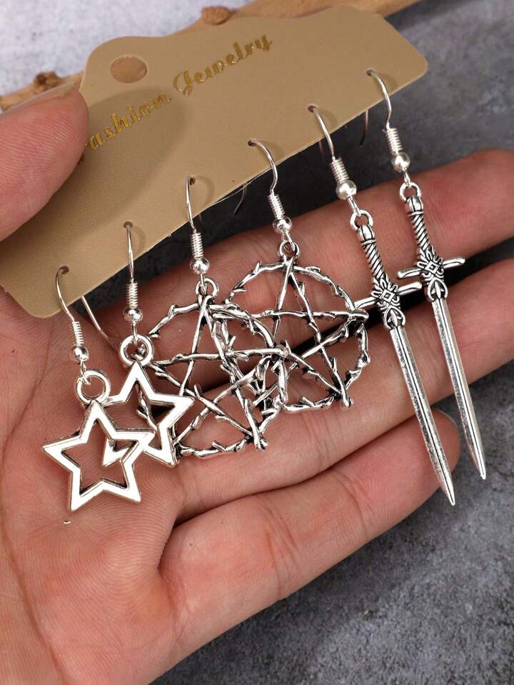 Goth 3 Pairs/set Star Pendant, Cross And Sword Design Earrings