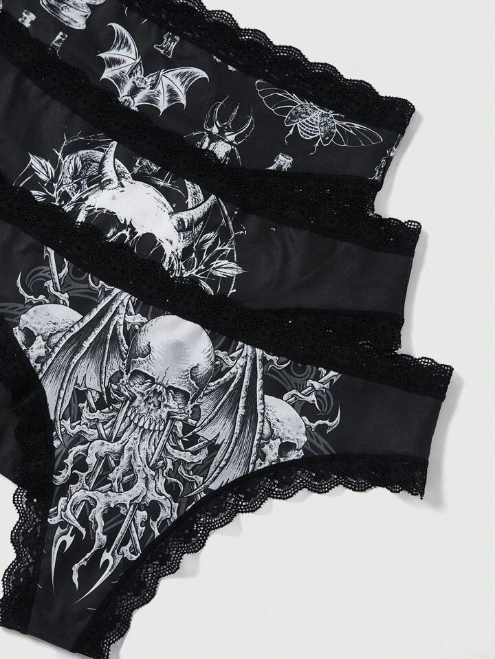 Goth 3Packs Plus Skull Print Contrast Lace Panty Set