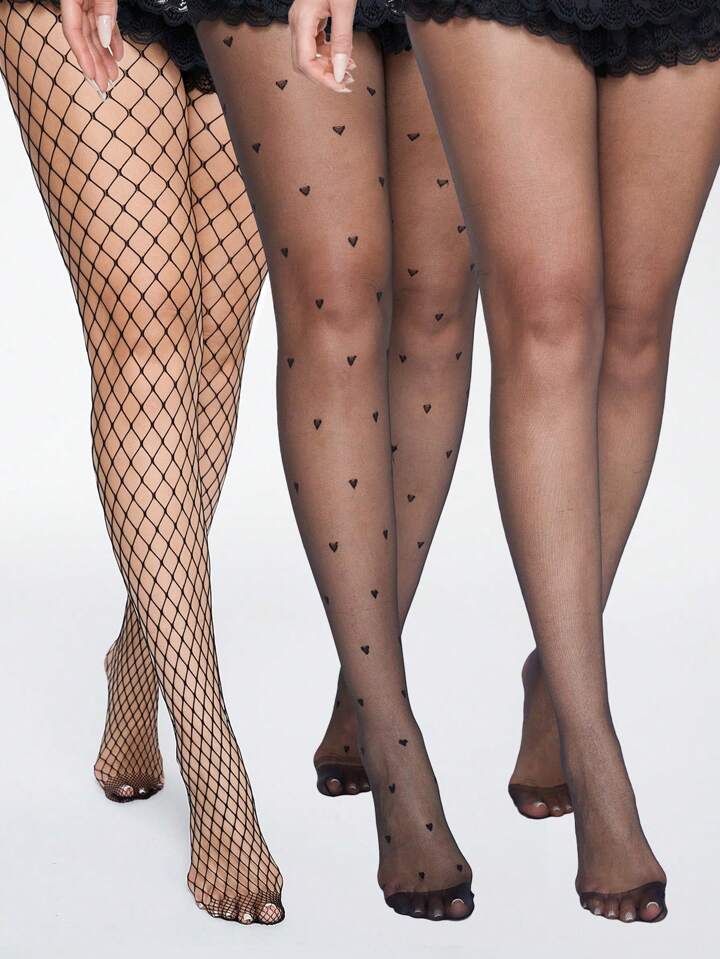 Goth 3pairs Pure Black Heart Stockings And Medium-To-Large-Sized Hollow Out Fishnet Tights Combination
