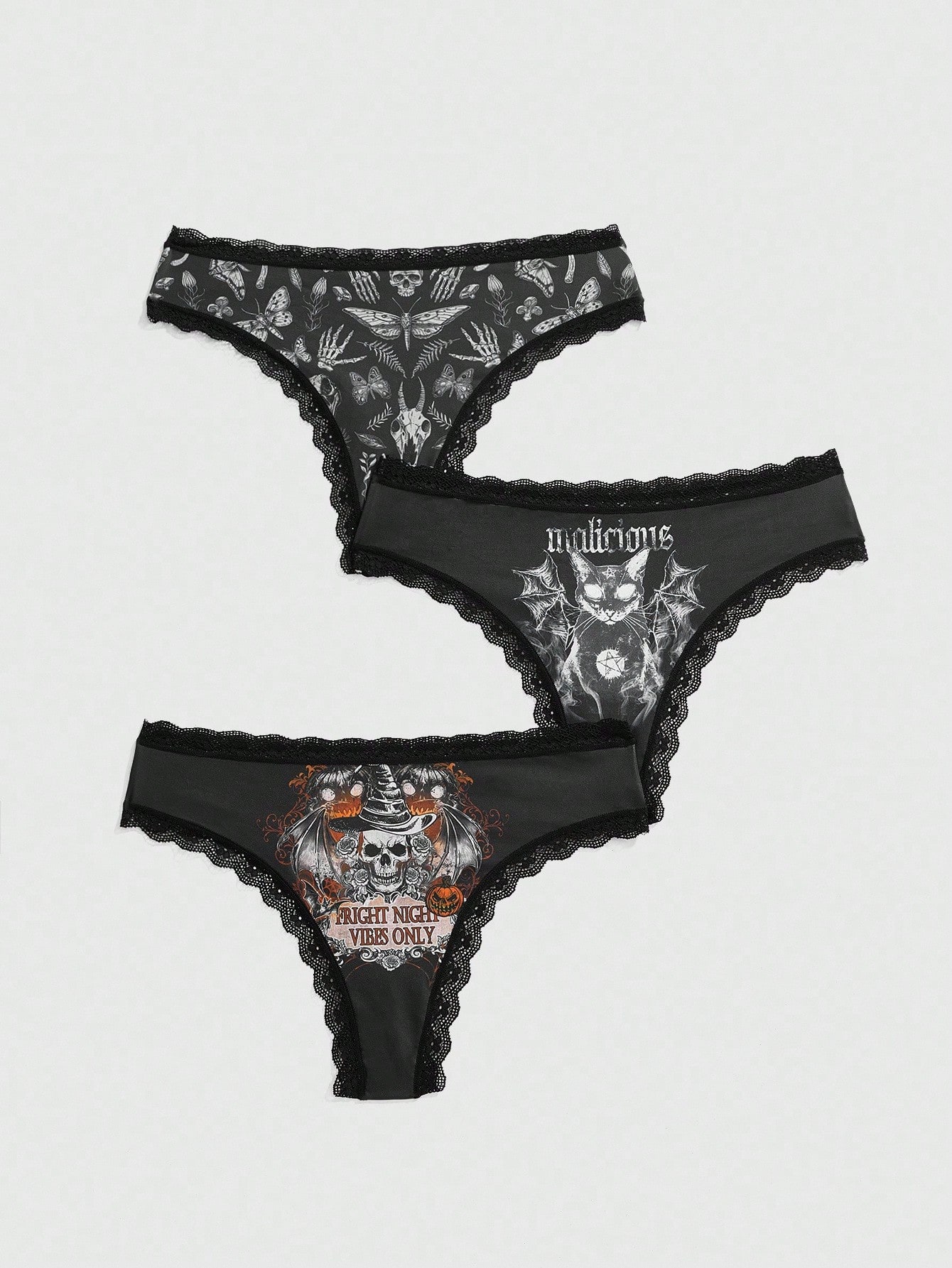 3pcs/Set Plus Size Gothic Halloween Skeleton, Bat, Pumpkin, Vine, Slogan, Rose, Black Cat, Skull, Butterfly, Moth, Mushroom, Plant Full Print Narrow Edge Thong Panties