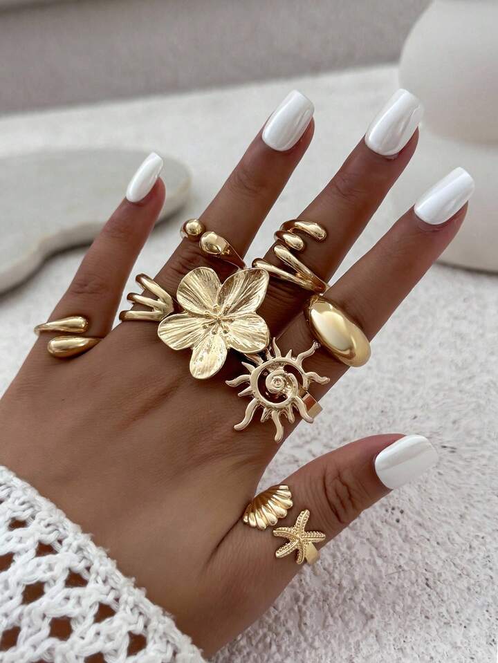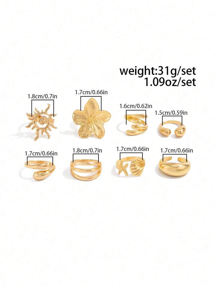 Goth 8pcs Fashion Ocean Style Rings, Glossy Starfish, Flower, Spiral, Sun, Geometric Metal Rings, Open Adjustable Gold Rings, Gift For Women/Daughter/Wife