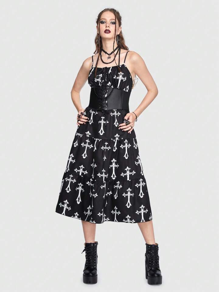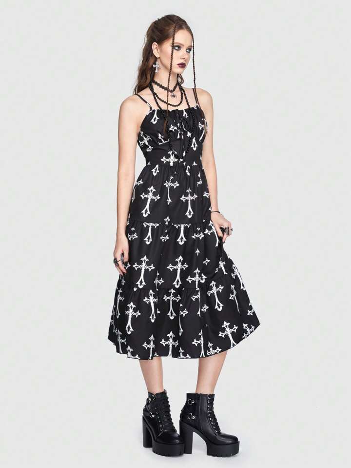 Goth Allover Cross Print Tie Front Cami Dress