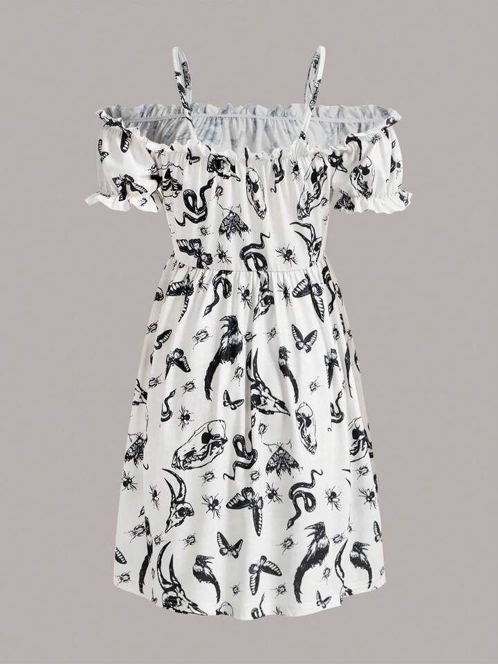 Goth Allover Print Cold Shoulder Frill Trim Dress