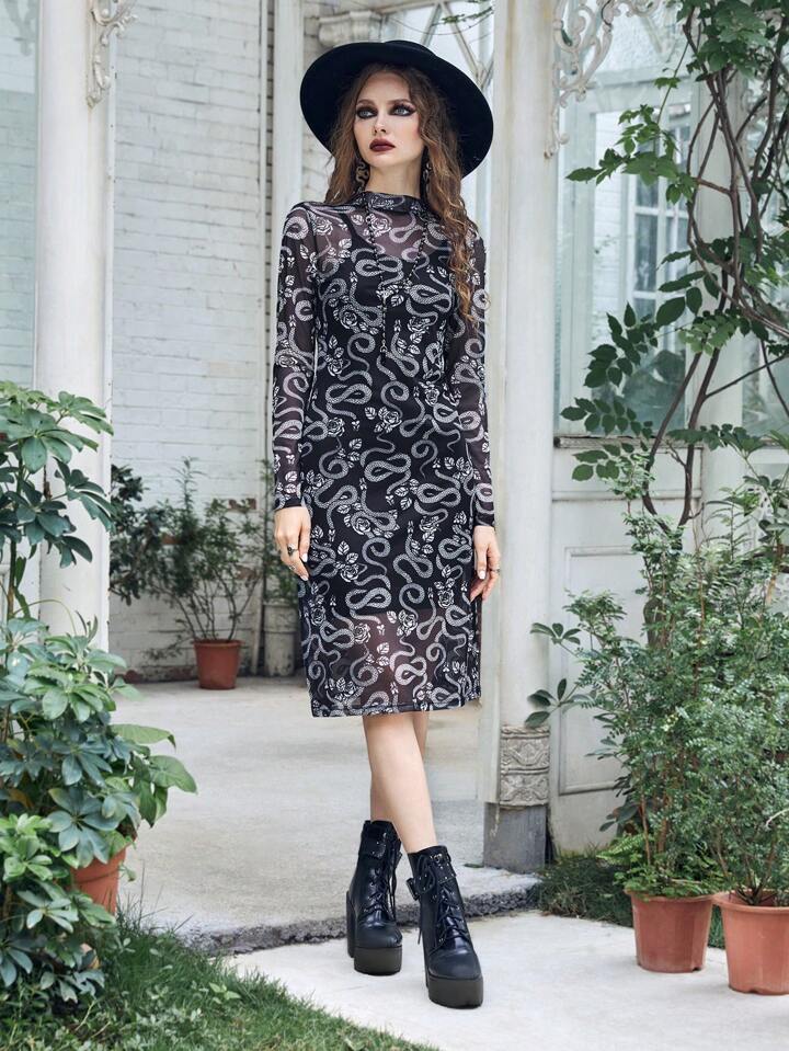 Goth Allover Snake Print Mock Neck Mesh Dress With Cami Dress