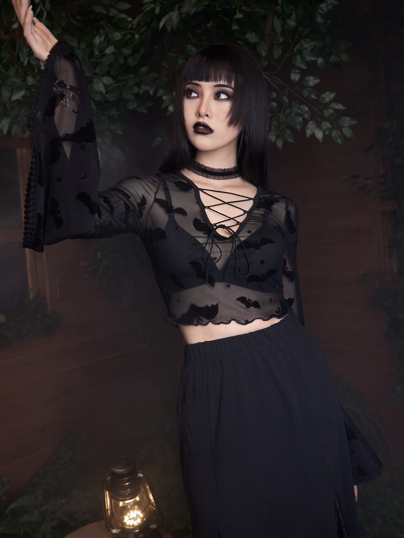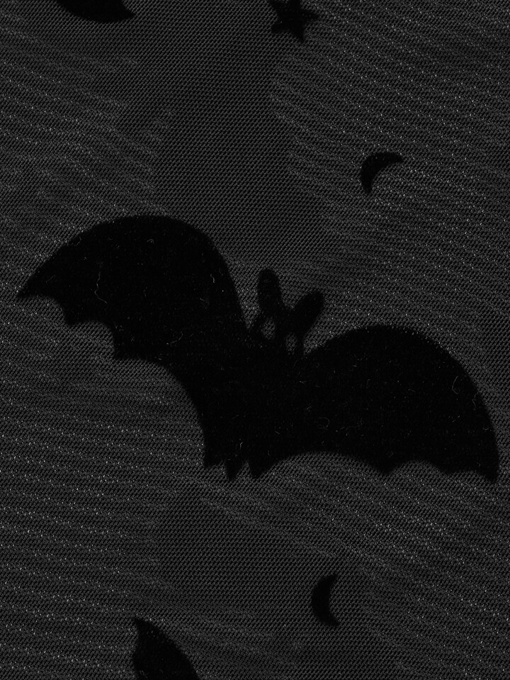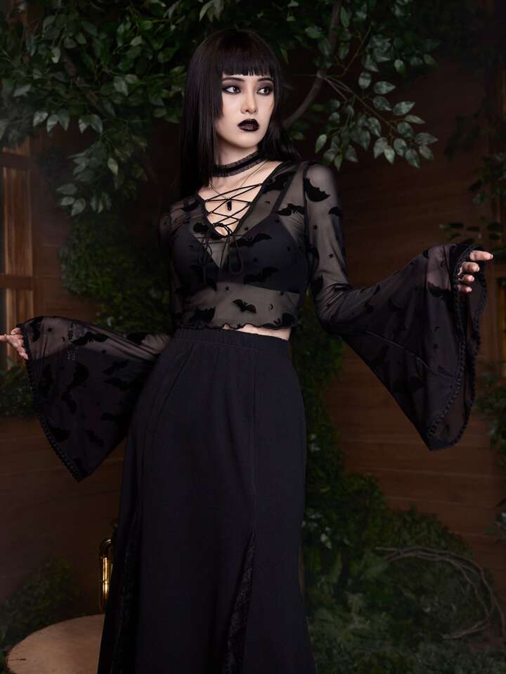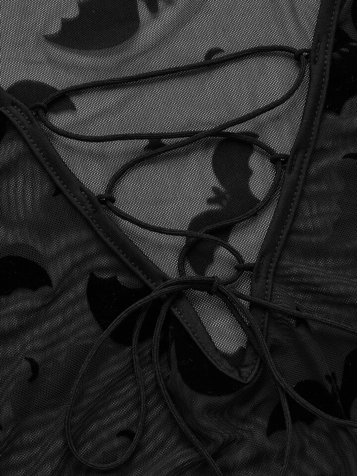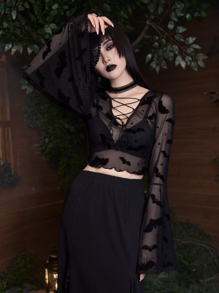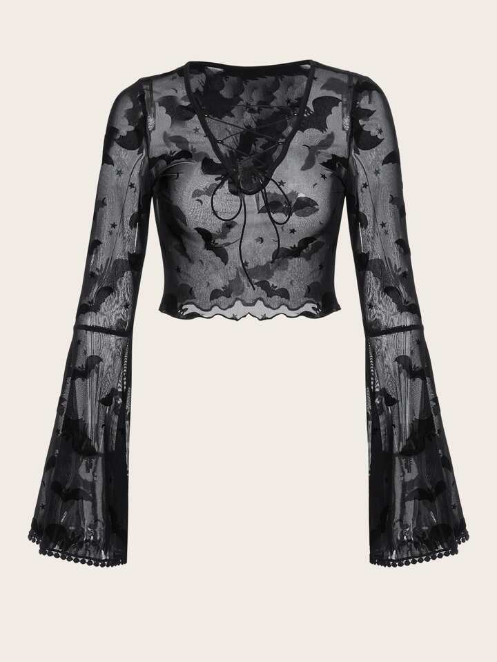 Goth Bat Print Lace Up Mesh Top