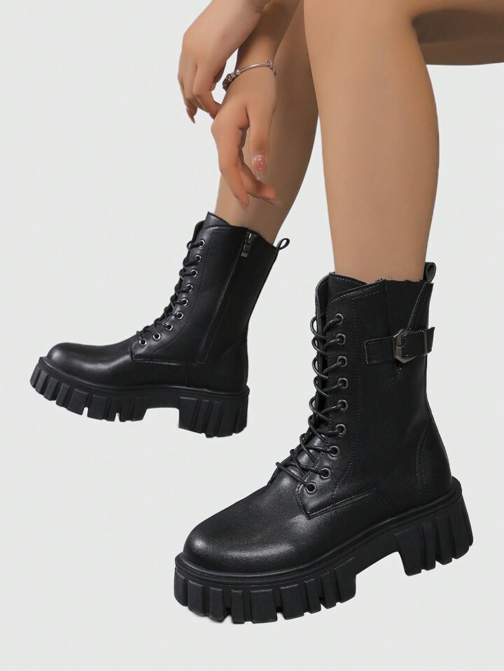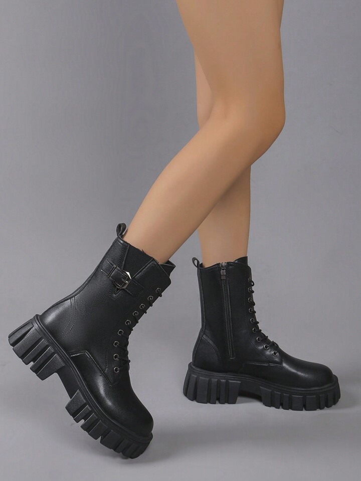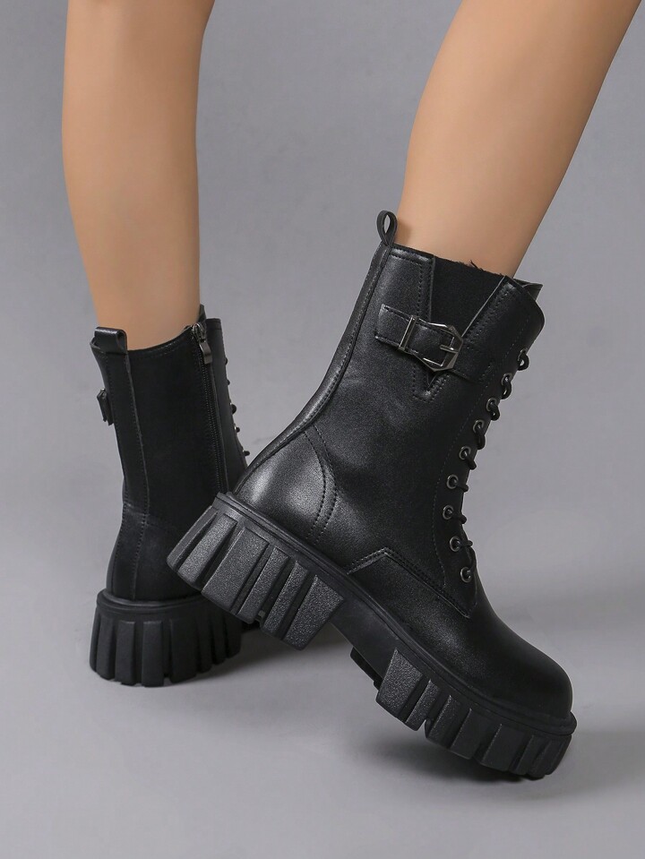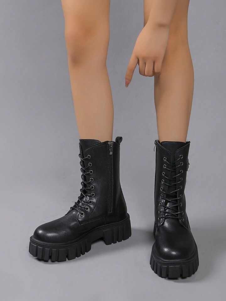 Goth Black Platform Boots For Women, Lace-Up Mid-Calf Thick Soled Boots, British Style