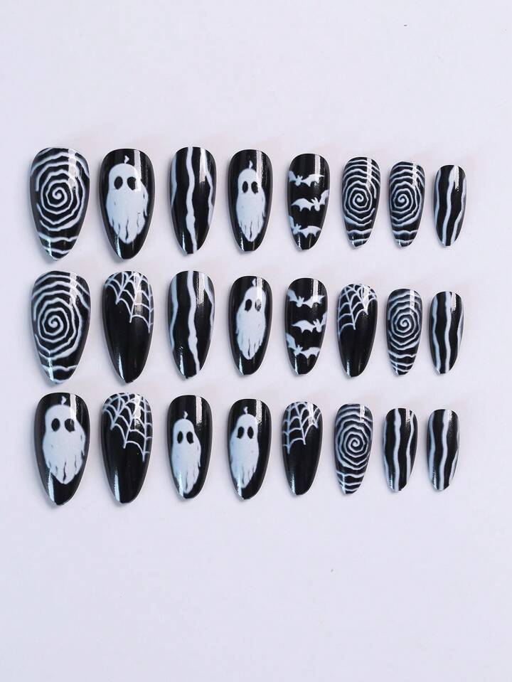 Goth Black & White Spider Web & Vortex Design Self-Adhesive Long False Press On Nails, Halloween Fake Nails, Black And White