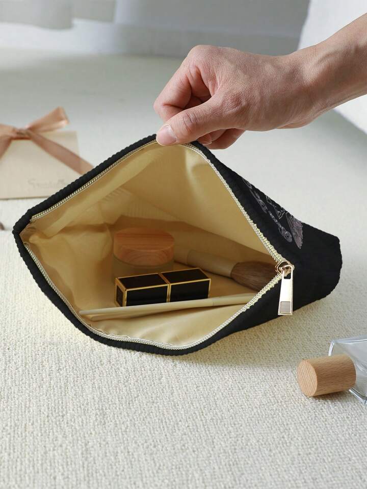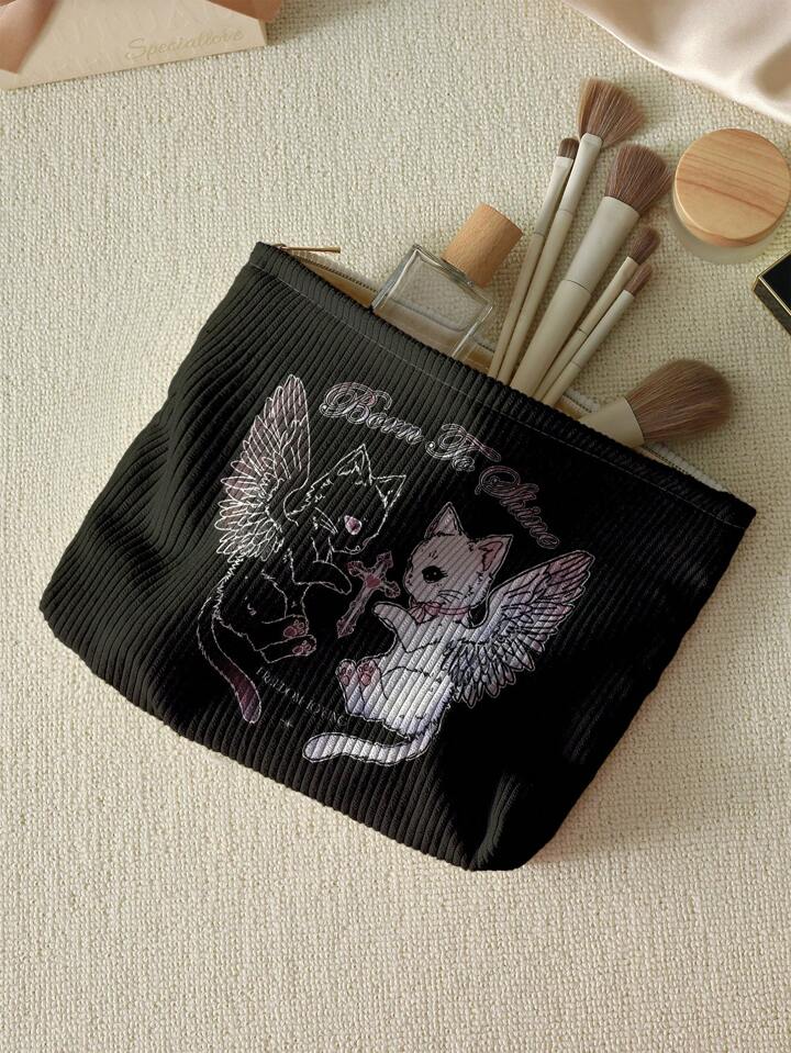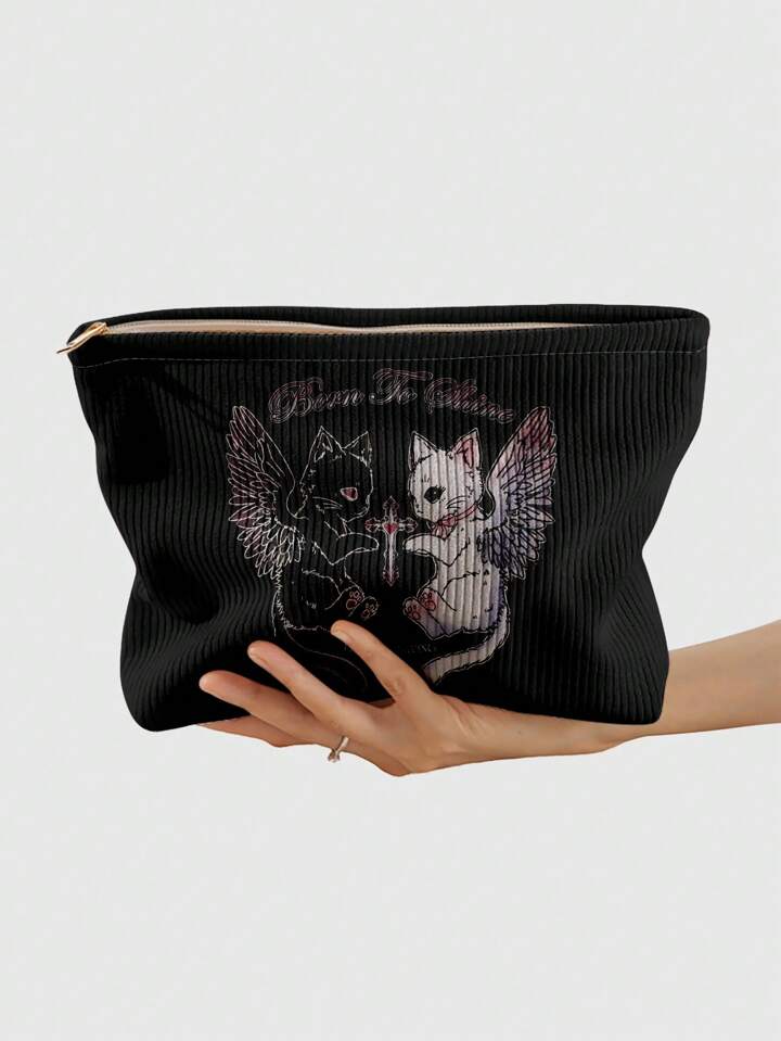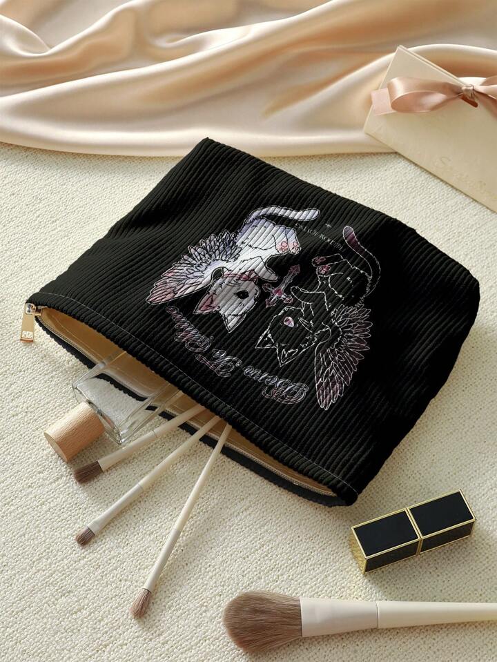 Goth Black & White Wing Cat Pattern Flannel Zipper Makeup Bag, Lightweight Multifunctional Lined Cosmetic Storage Pouch