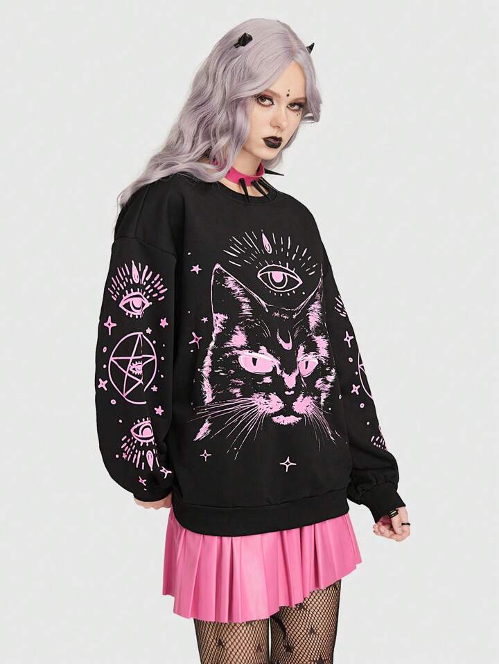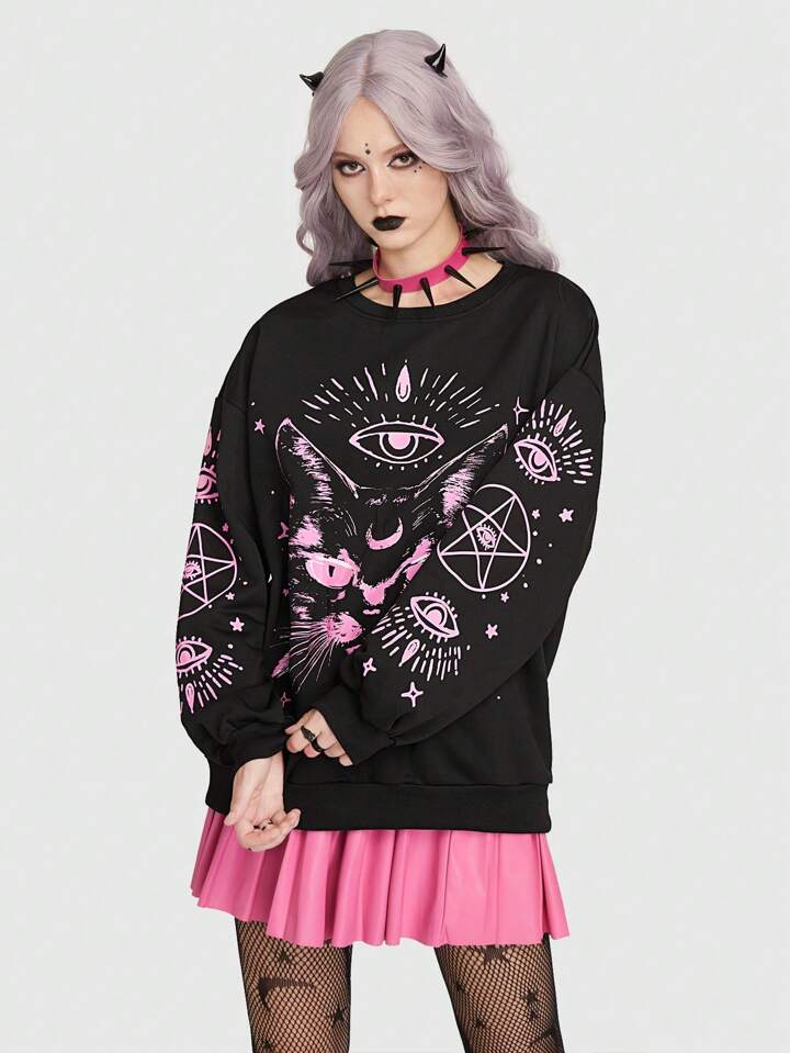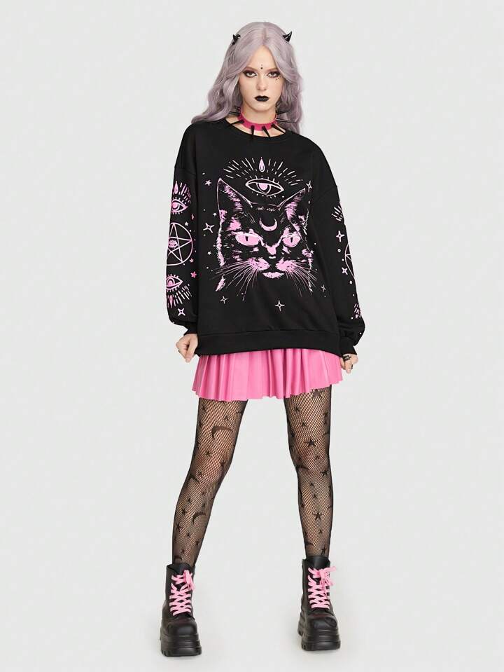 Goth Cat Graphic Drop Shoulder Sweatshirt