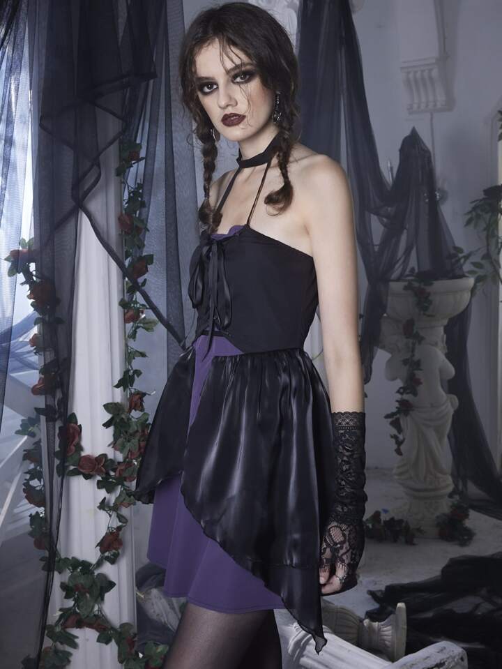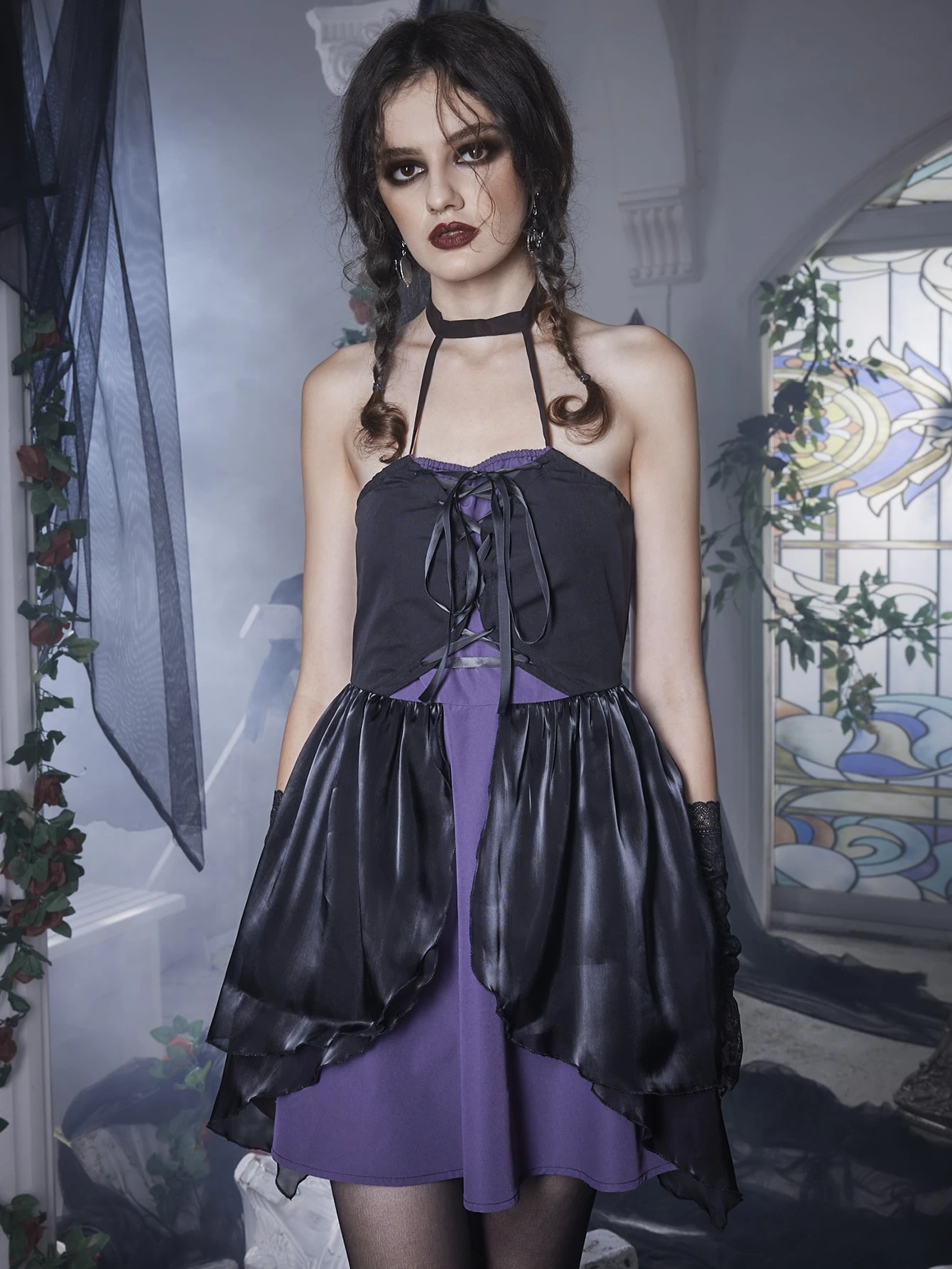 Goth Colorblock Lace Up Asymmetric Hem Halter Dress