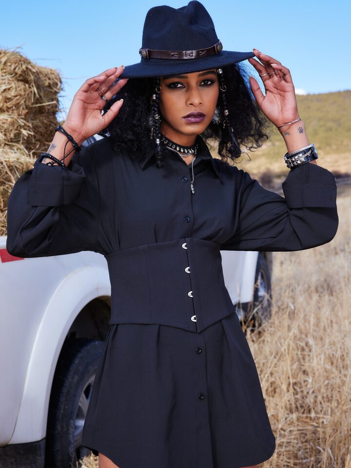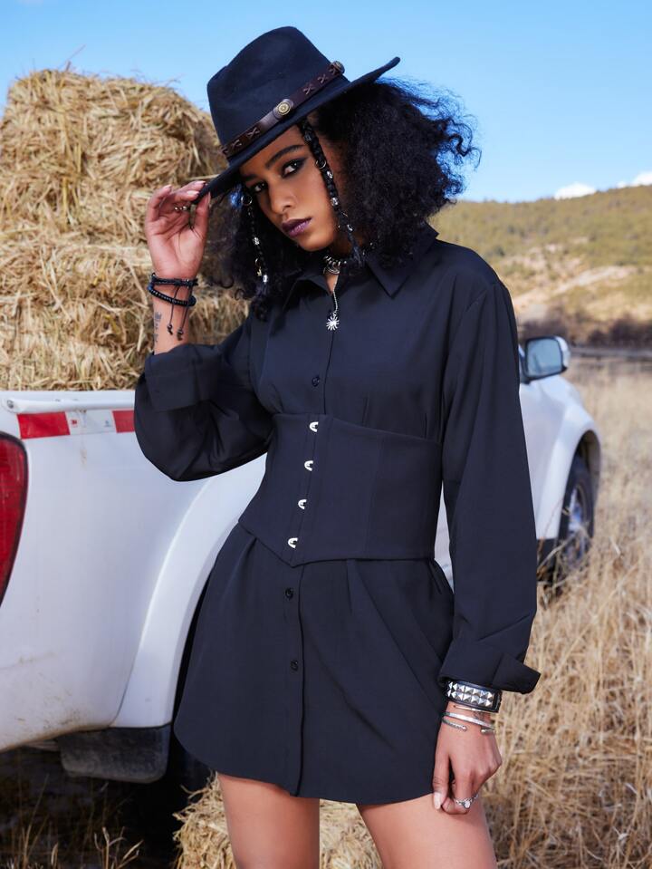 Goth Cowgirl Solid Button Front Shirt Dress & Corset
