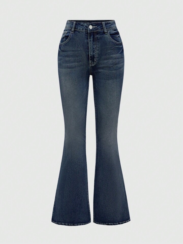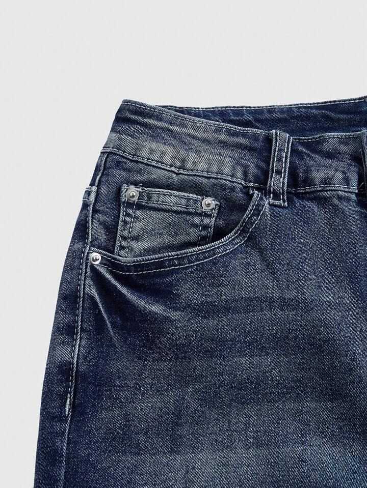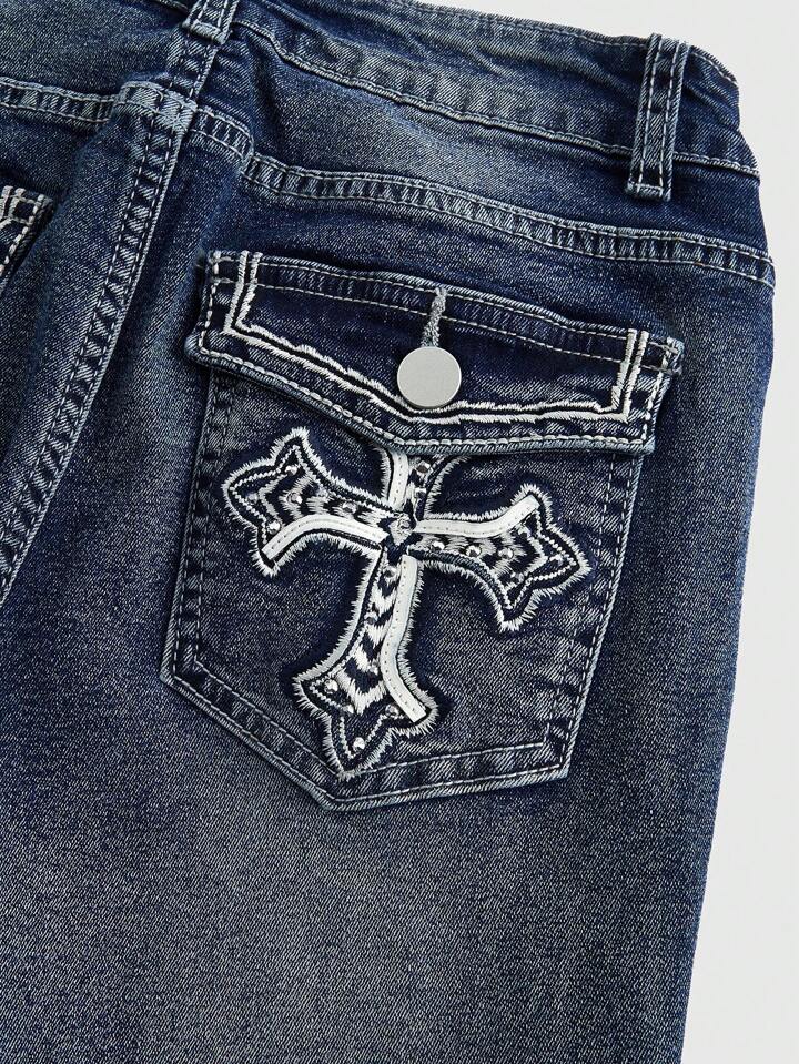 Goth Cross Embroidered Pocket Button Flare Leg Skinny Jeans