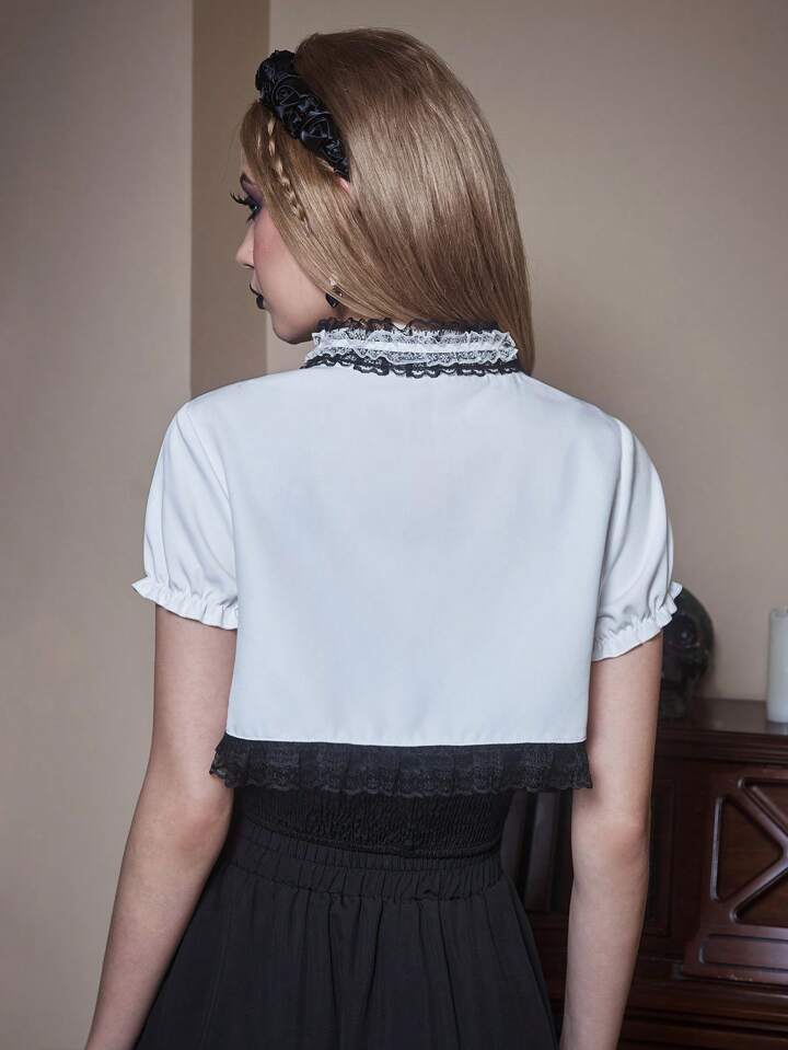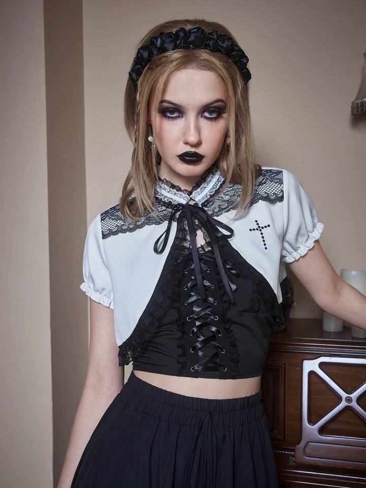 Goth Cross Pattern Contrast Lace Crop Top