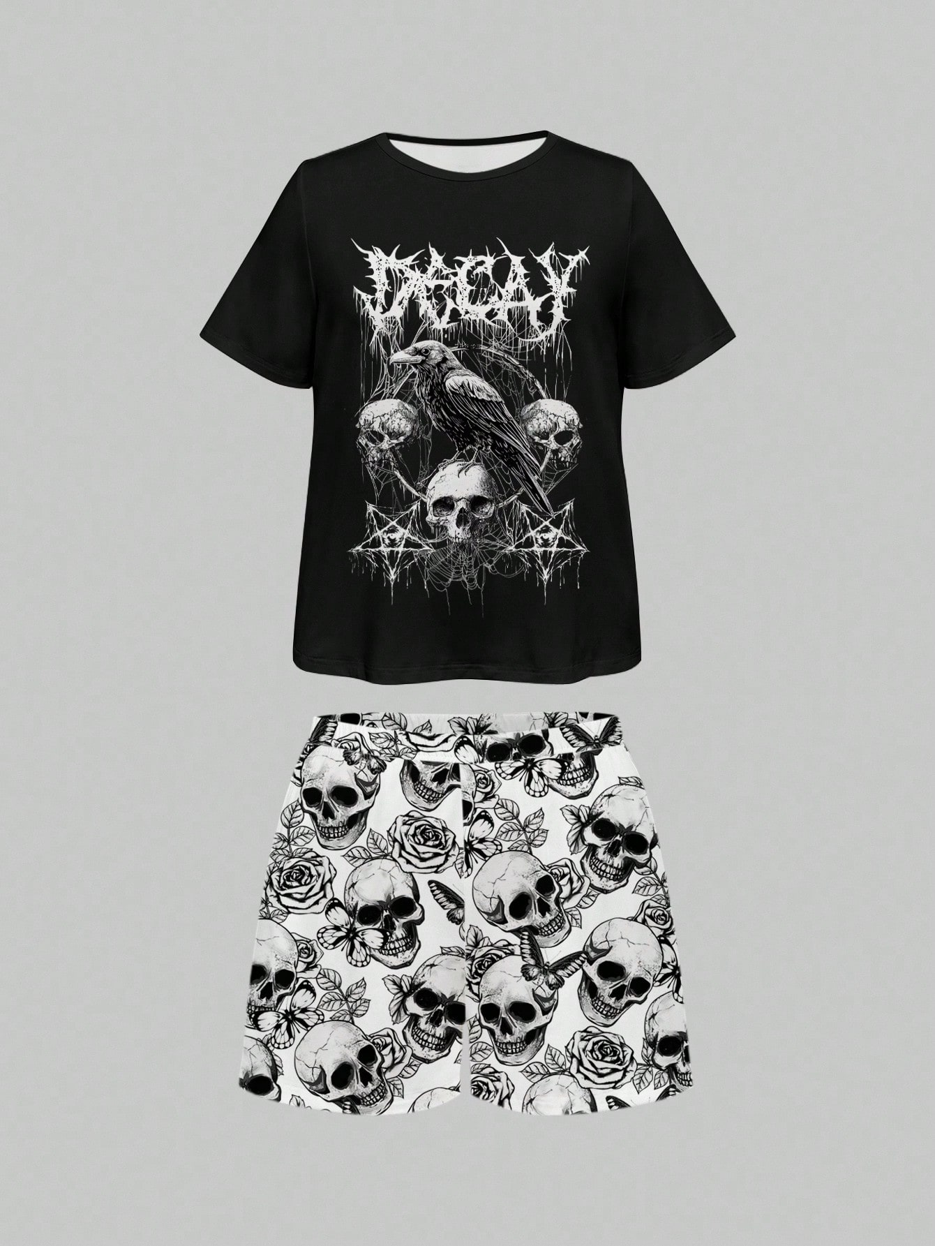 Crow Skeleton, Spider Web, Gothic Rose Skull Full Print Plus Size Short Sleeve Top And Shorts Pajama Set, Casual Sleepwear