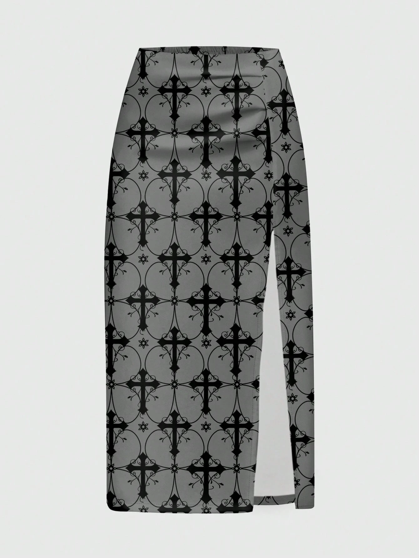 Goth Dark Mysterious Ruched Cross Baroque Vine Print High Slit Skirt For Women