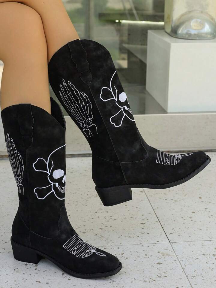 Goth Dark Punk Skull Ghost Hand Embroidery Design Square Toe Chunky Heel Over-The-Knee Western Knight Boots