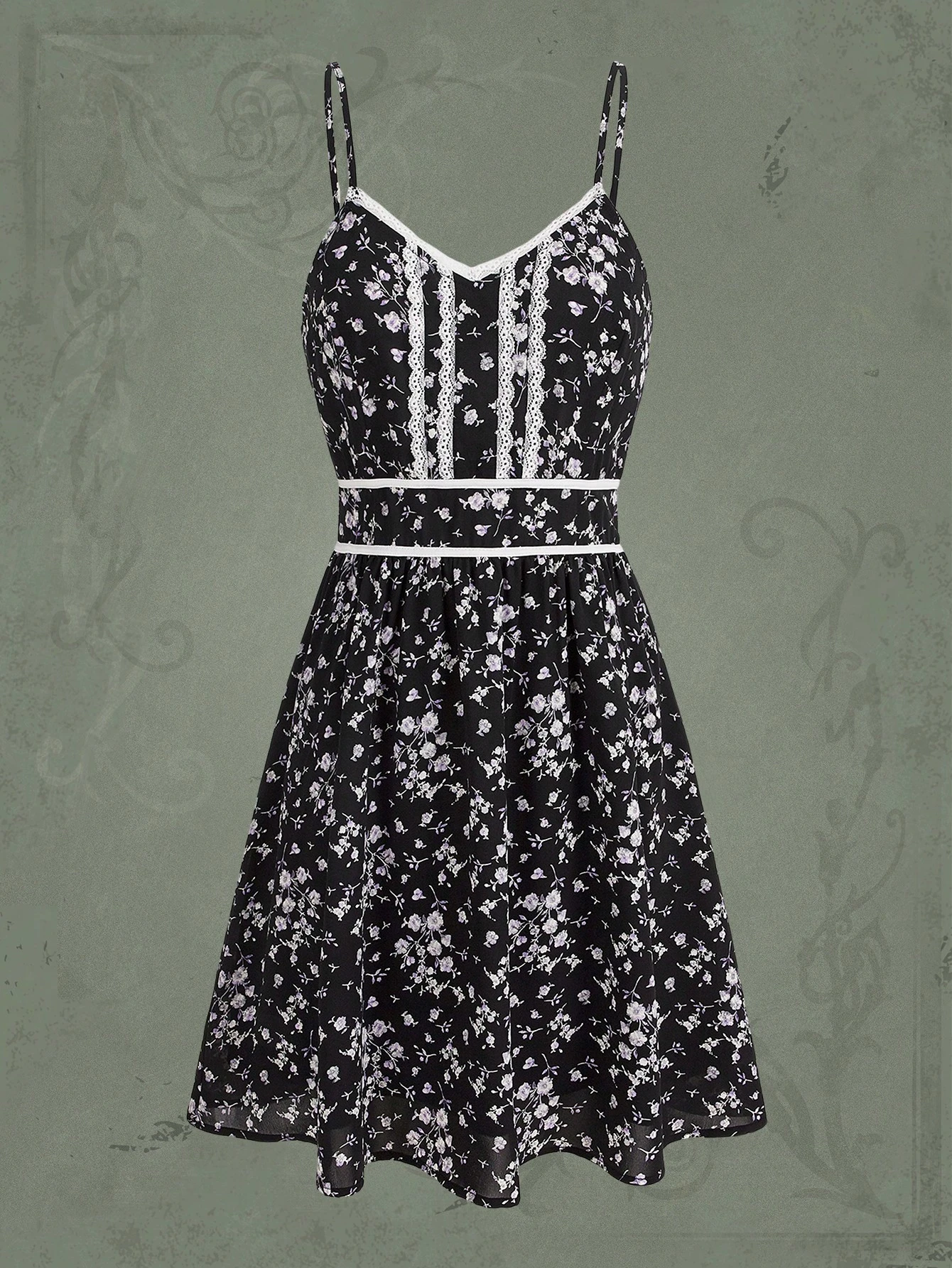 Goth Ditsy Floral Print Contrast Lace Cami Dress