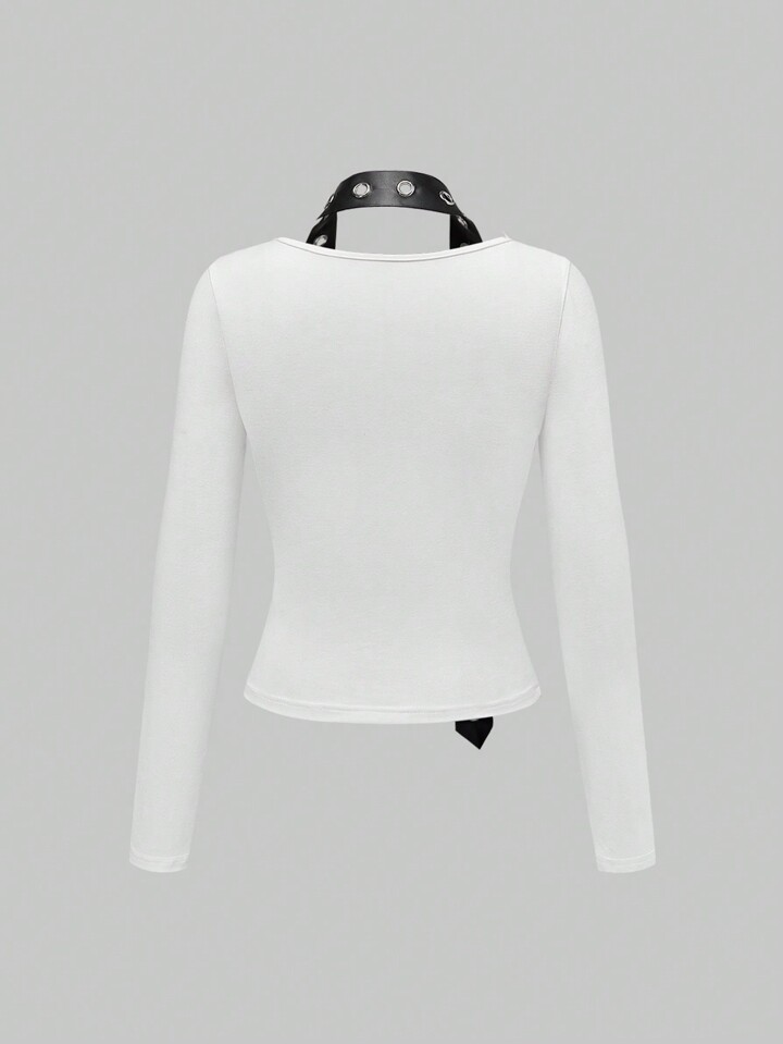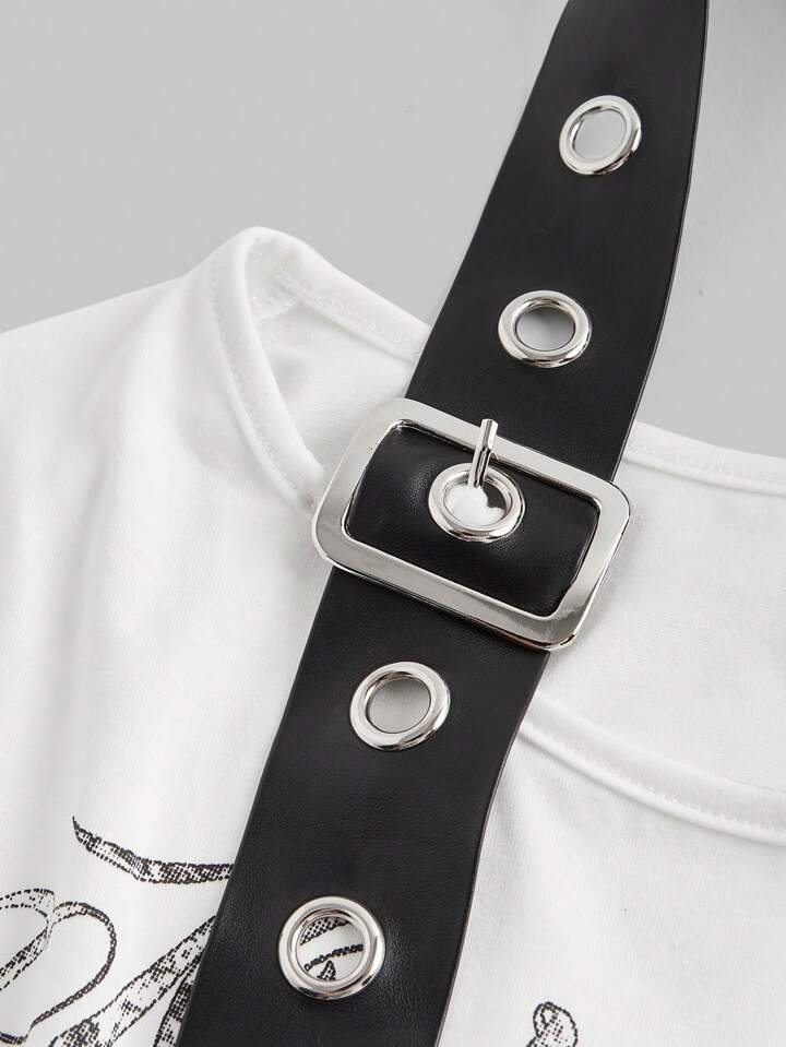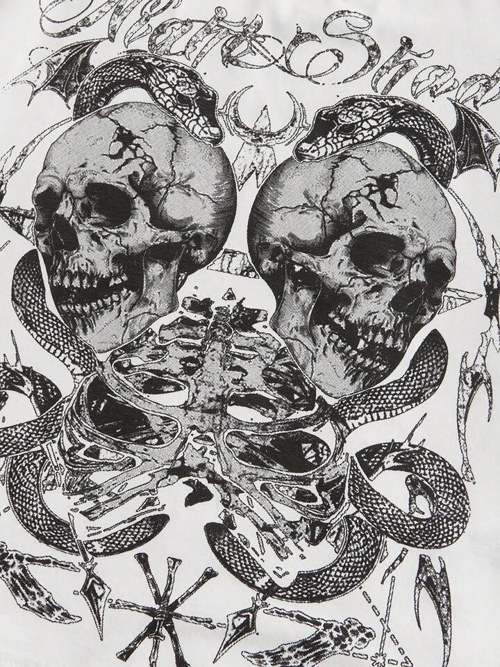 Goth Fashion Women's Spring/Summer Skull Print Splicing PU Leather Peplum Long Sleeve T-Shirt With Eyelets