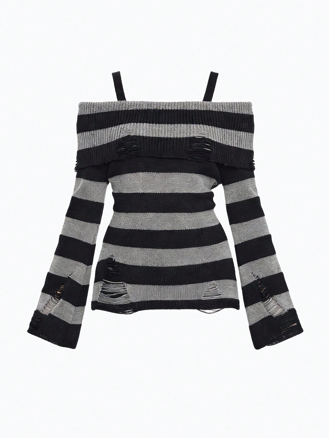 Goth Fashionable Dark Punk Distressed Design Waist Cinched Off-Shoulder Crew Neck Black & Grey Striped Sweater