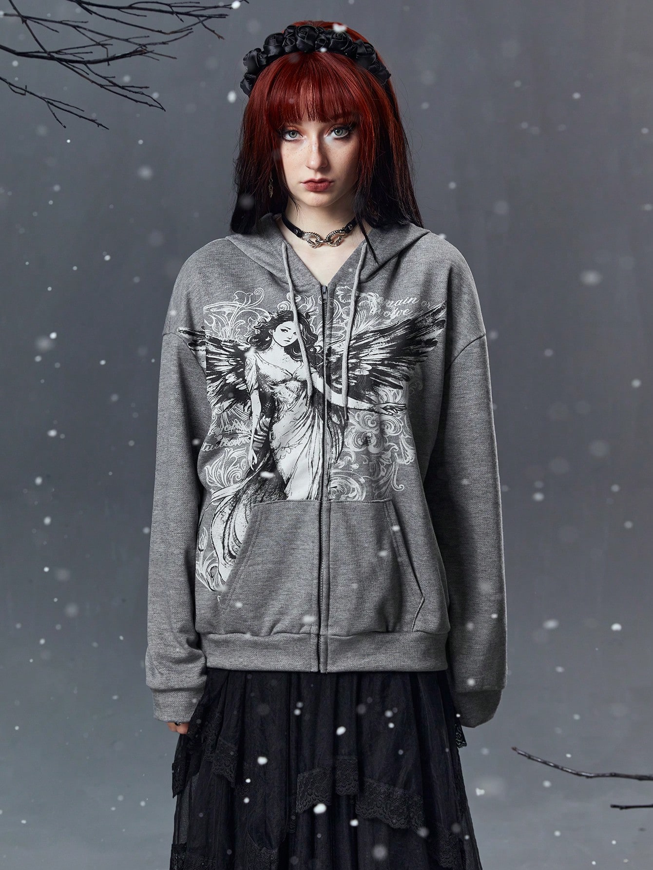 Goth Figure Graphic Zip Up Drawstring Hoodie