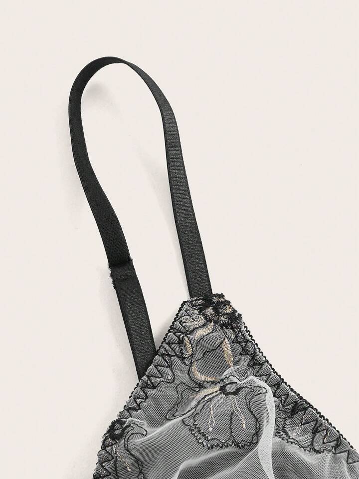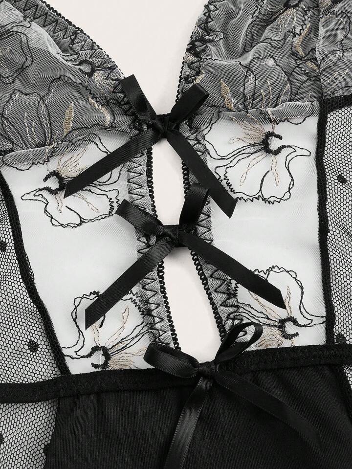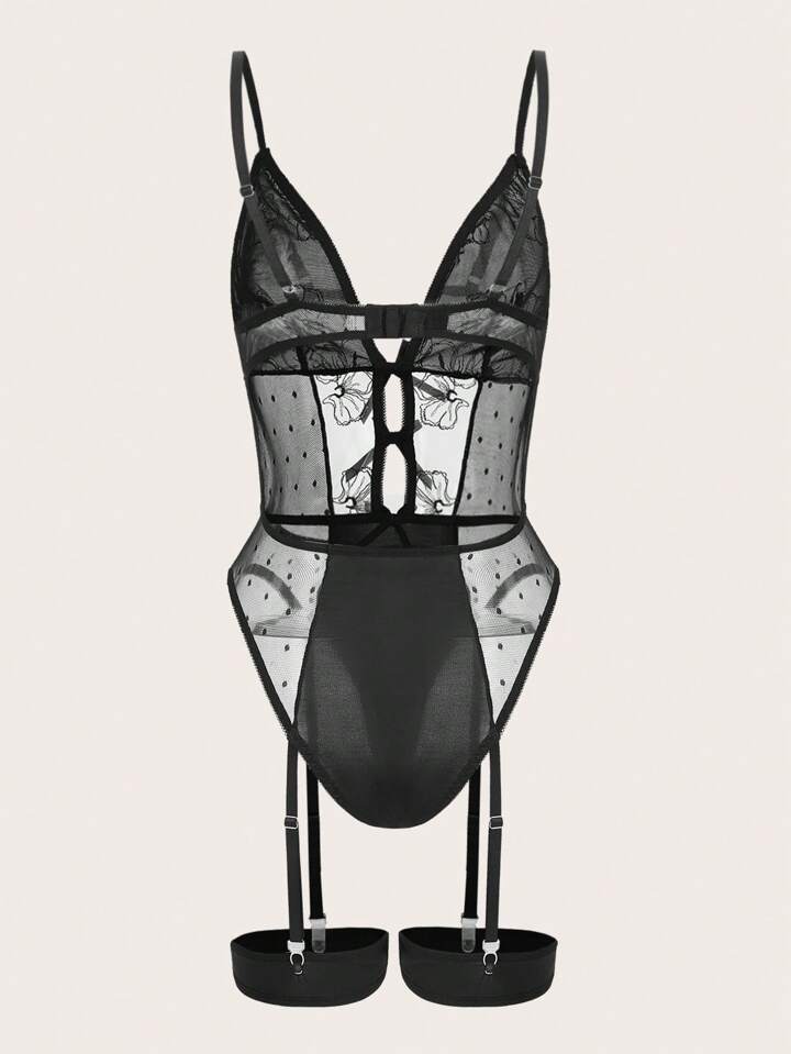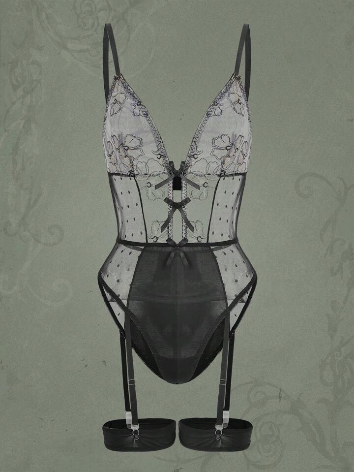 Goth Floral Embroidery Mesh Garter Teddy Bodysuit With Leg Ring