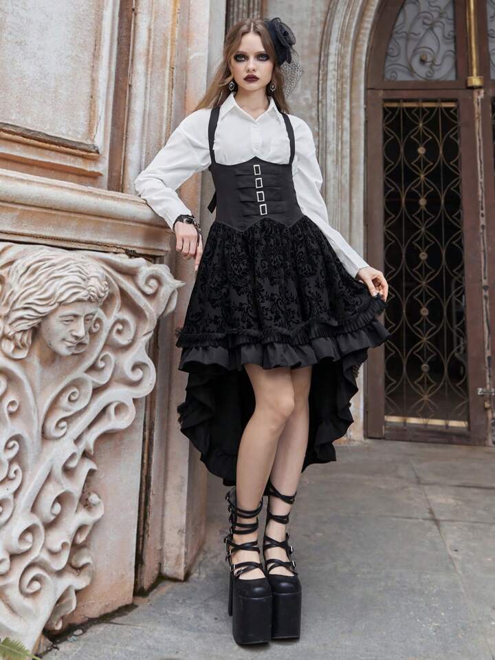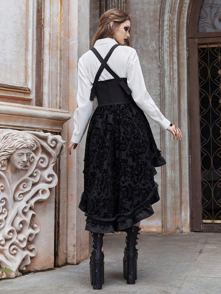 Goth Floral Jacquard Buckle Front High Low Hem Overall Dress Without Blouse