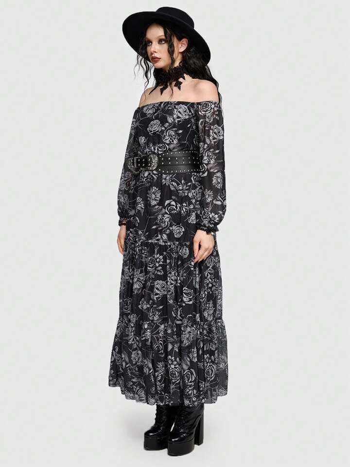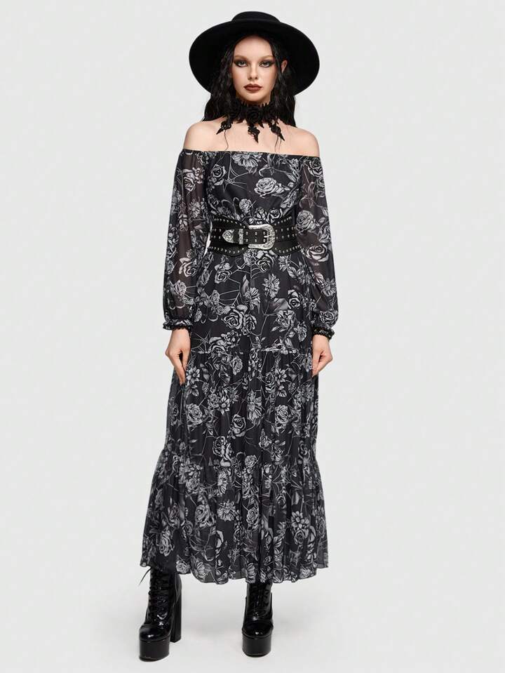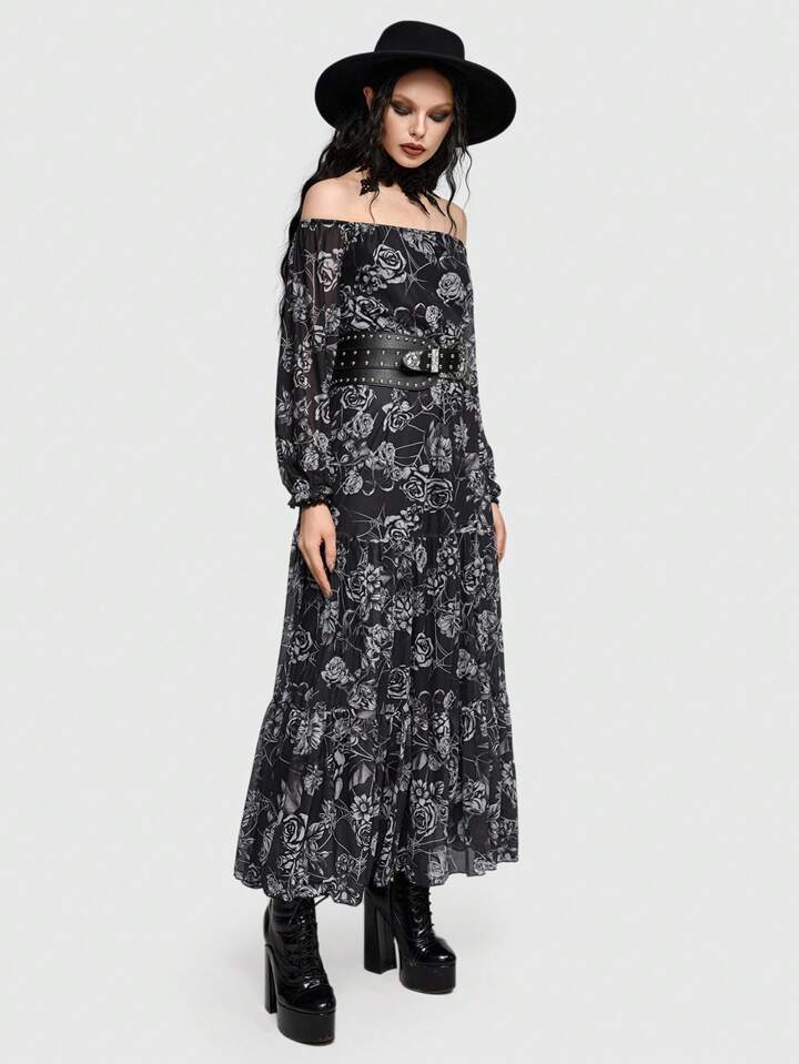 Goth Floral Print Off Shoulder Flounce Sleeve Dress Without Corset